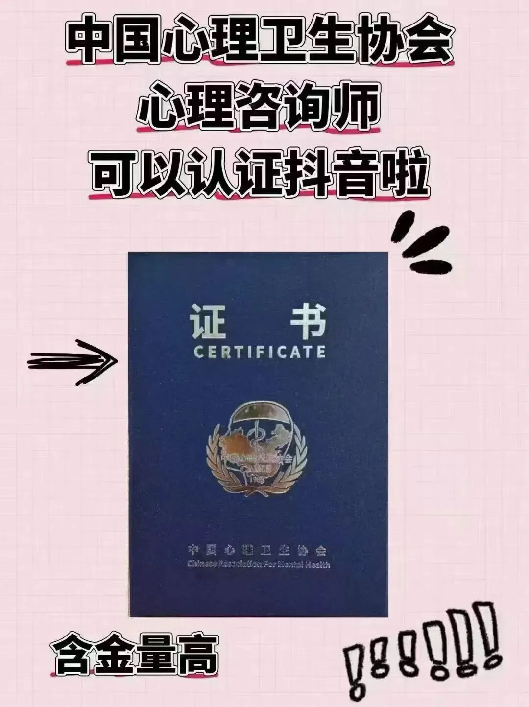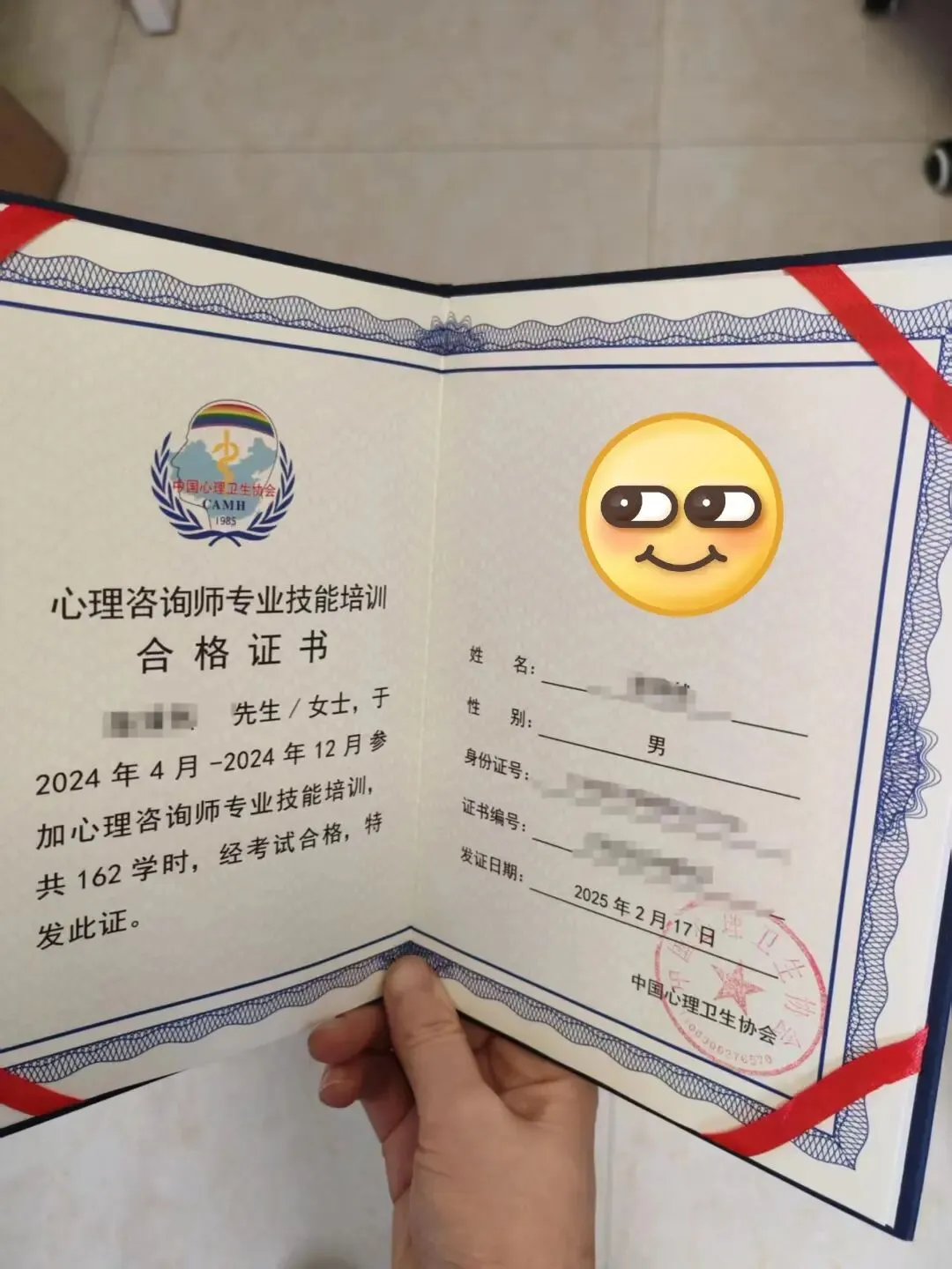 下图是中国心理卫生协会颁发的心理咨询师专业技能培训合格证书,相对来说是目前市面上可以考取的认可度、含金量较高的一个证书。