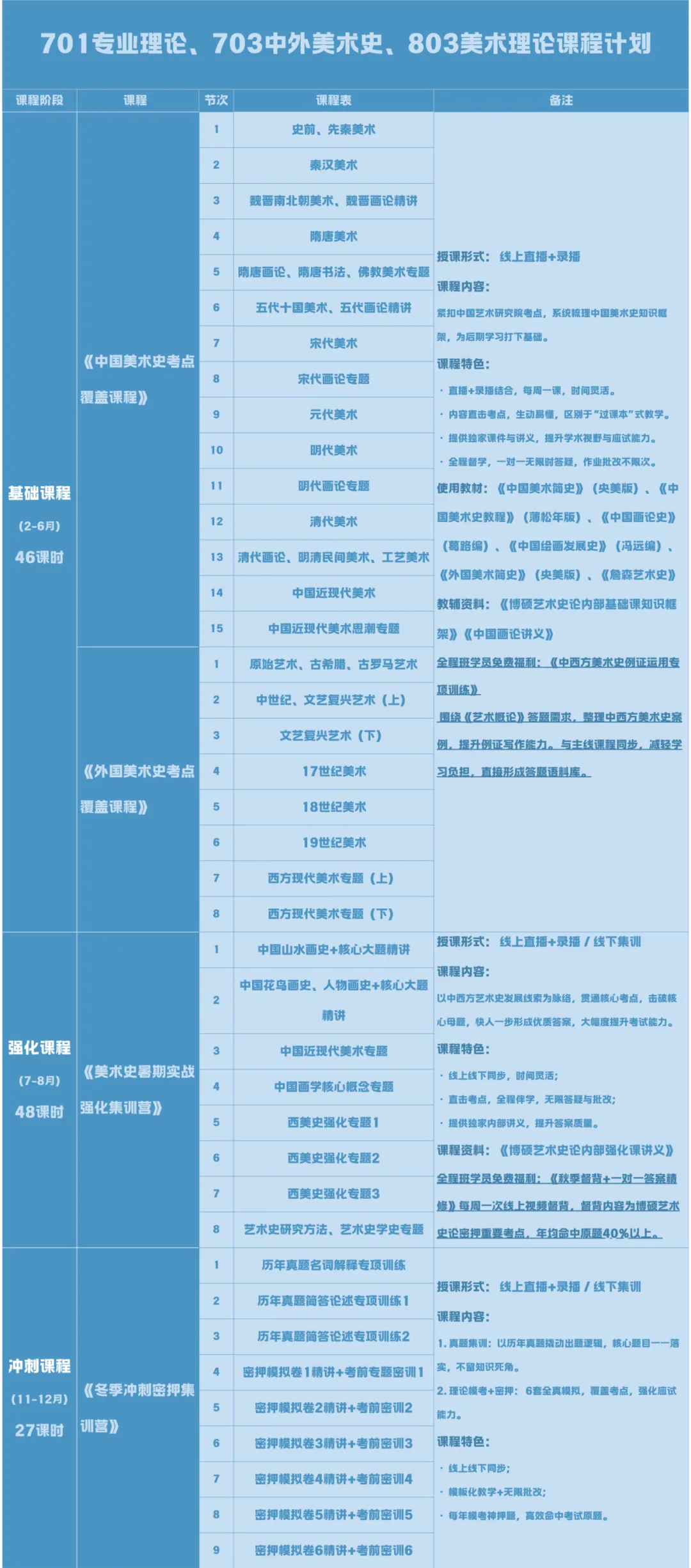 《专业理论》和《中外美术史论》《美术理论》等课程,各分为三个阶段:基础导学课程、暑期强化集训营、冬季冲刺密押集训营。
