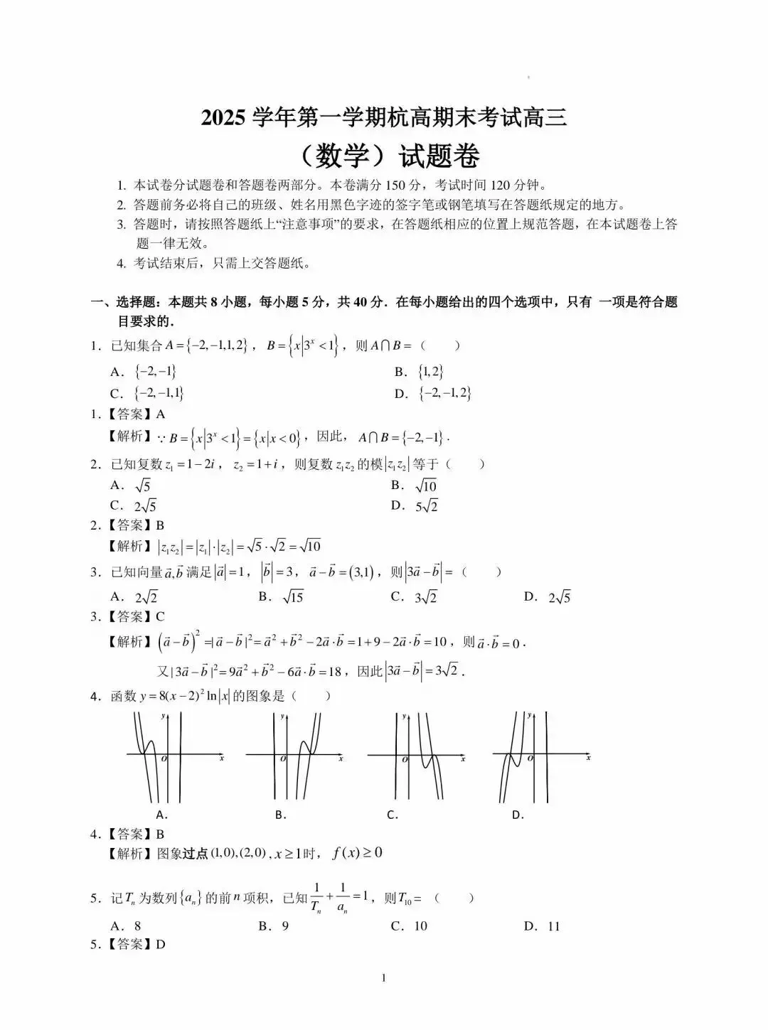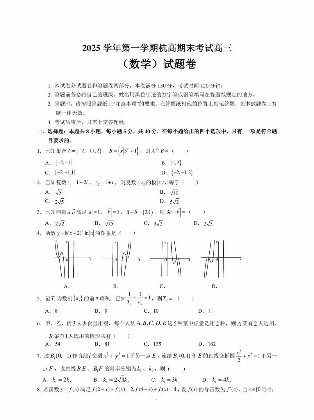 >026年1月杭州高级中学高三期末考试数学试卷及逐题详解