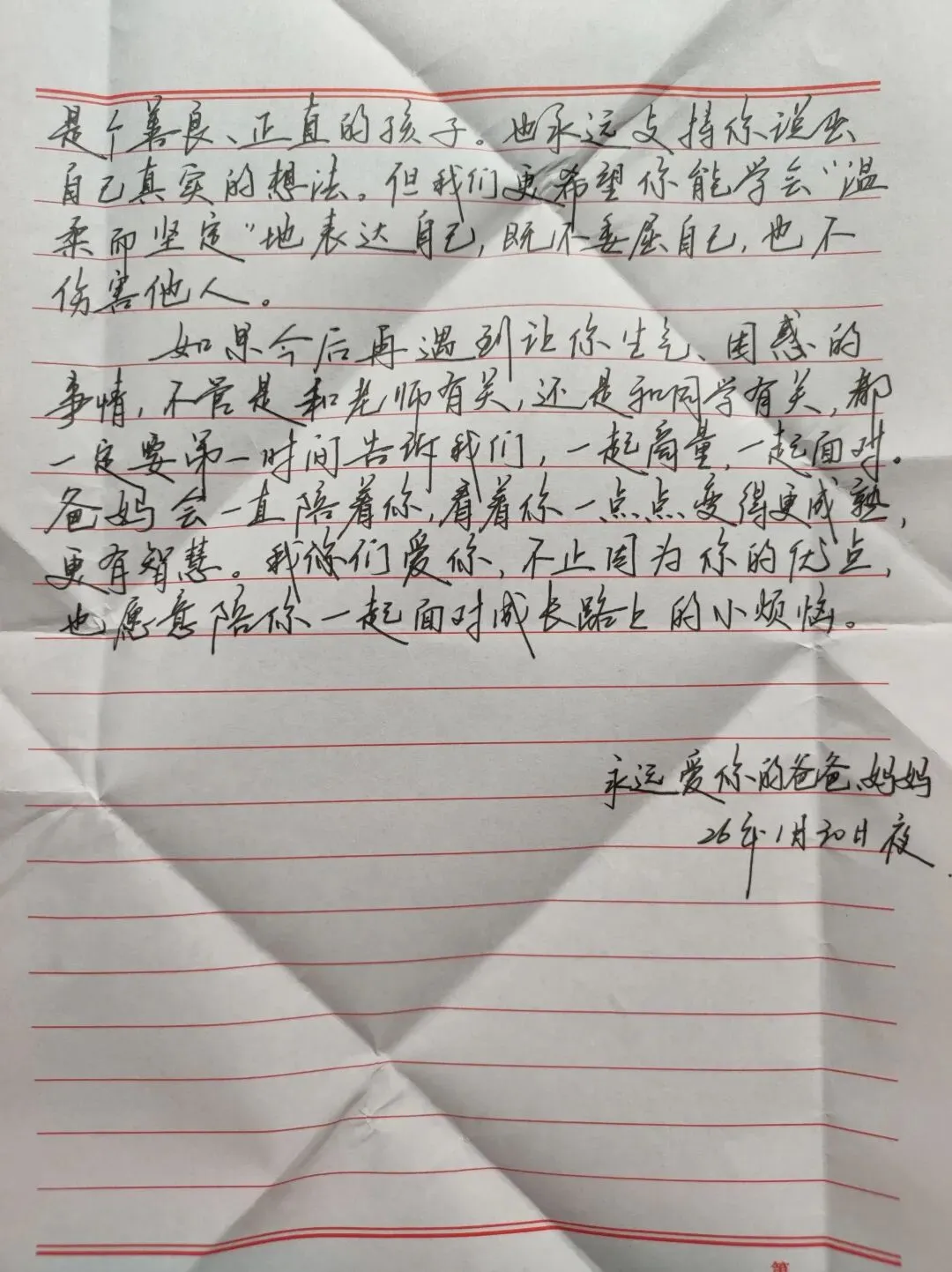 如果今后再遇到让你生气、困惑的事情,不管是和老师有关,还是和同学有关,都一定要第一时间告诉我们,一起商量,一起面对。爸妈会一直陪着你,看着你一点点变得更成熟更有智慧。我们爱你,不止因为你的优点,也愿意陪你一起面对成长路上的小烦恼。