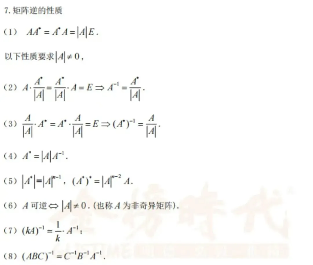 5、逆矩阵仅对方阵定义,且必须满足∣A∣≠0,非方阵无逆矩阵。