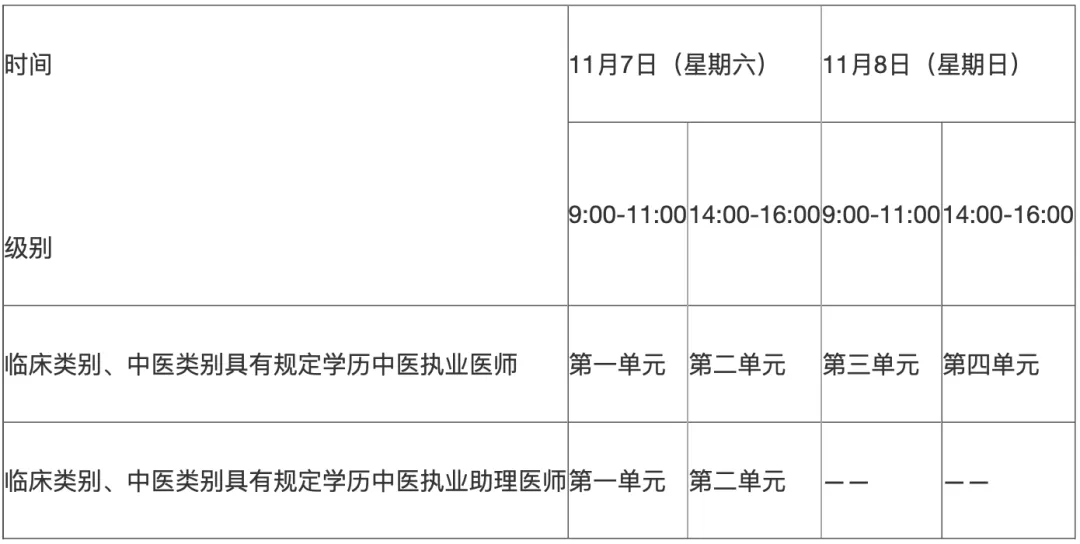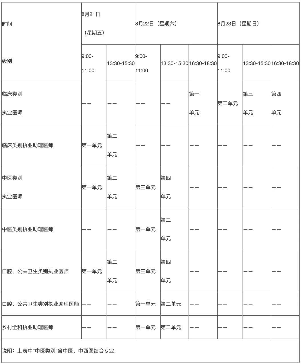 考试实行计算机化考试,军队现役人员、文职人员加试军事医学,院前急救岗位和儿科专业加试相应内容。执业医师合格分数线为360分,执业助理医师合格分数线为180分。全国统一考试时间如下: