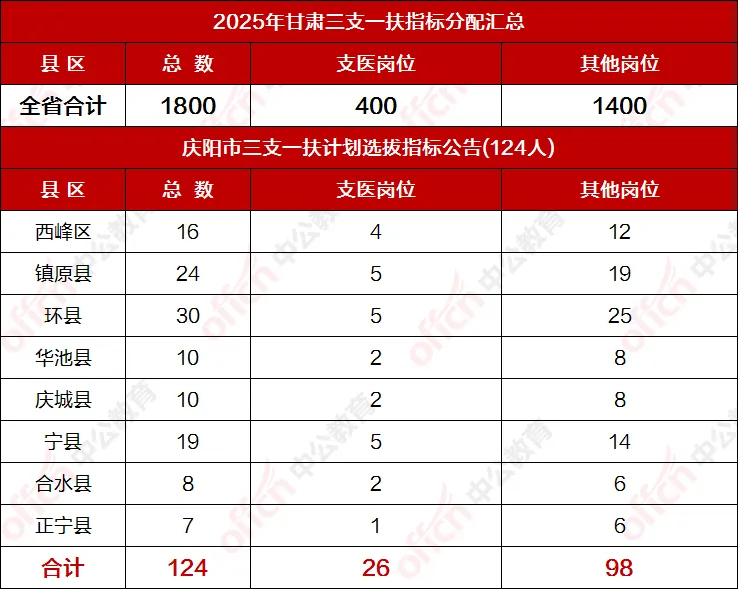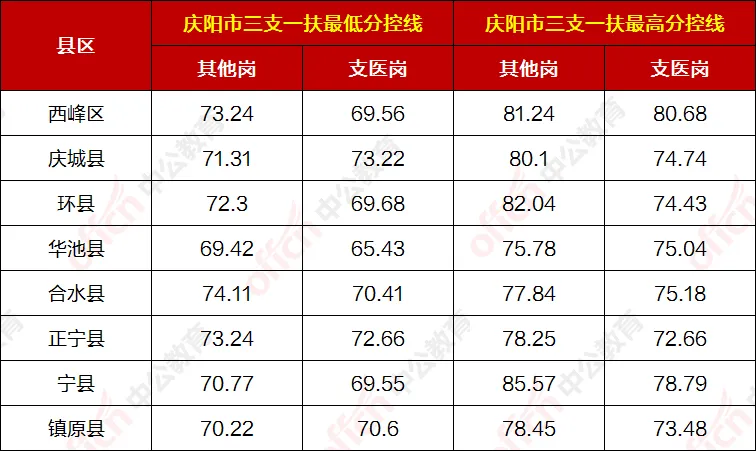 2026年甘肃三支一扶公告预计于2026年5月份发布公告,笔试预计6月底或7月初。下面是甘肃中公教育整理的2025年庆阳市三支一下招聘指标及分数线,供参考。下面是根据官方成绩表整理的庆阳市各县区录取最低|最高分控线,仅供参考。