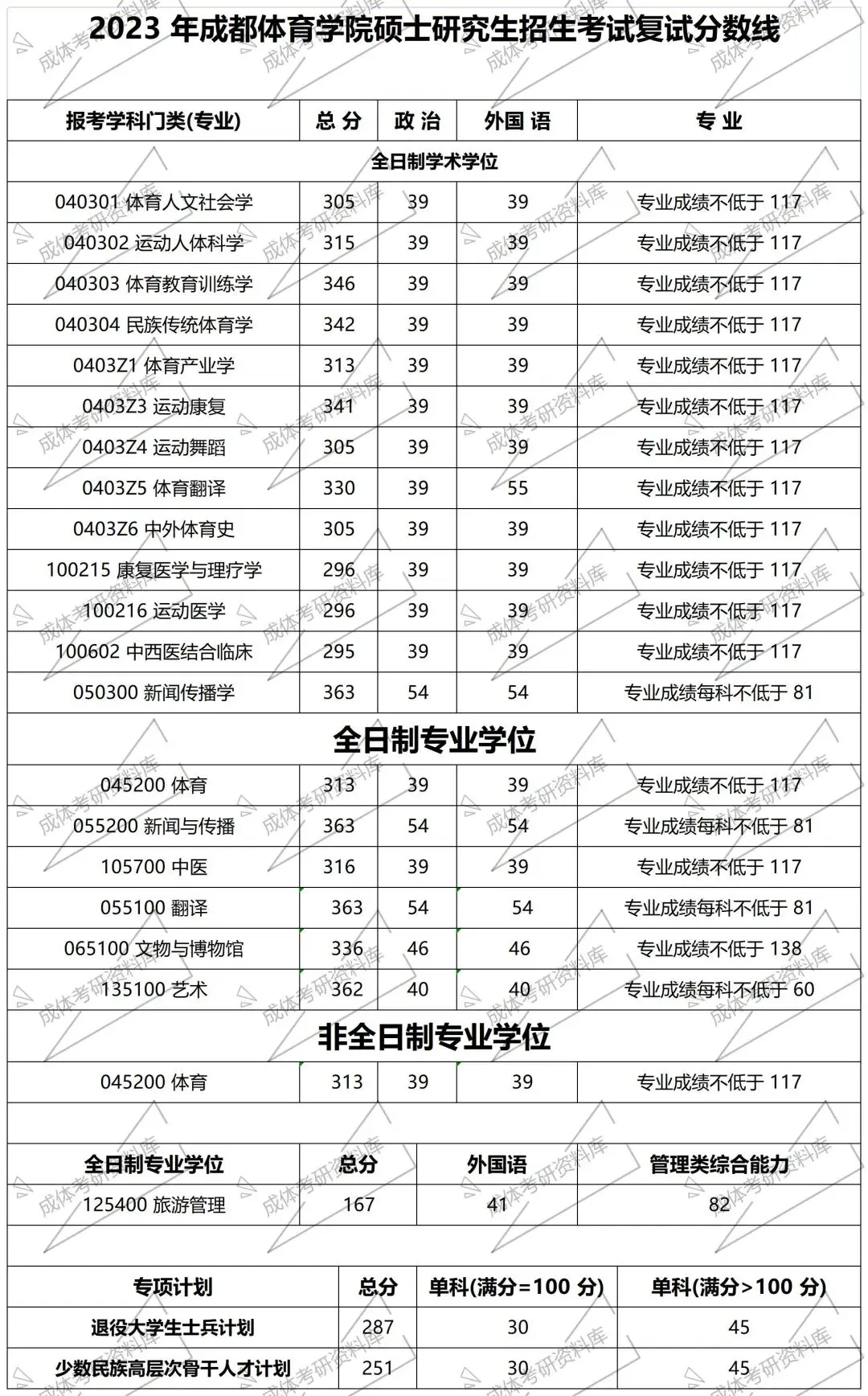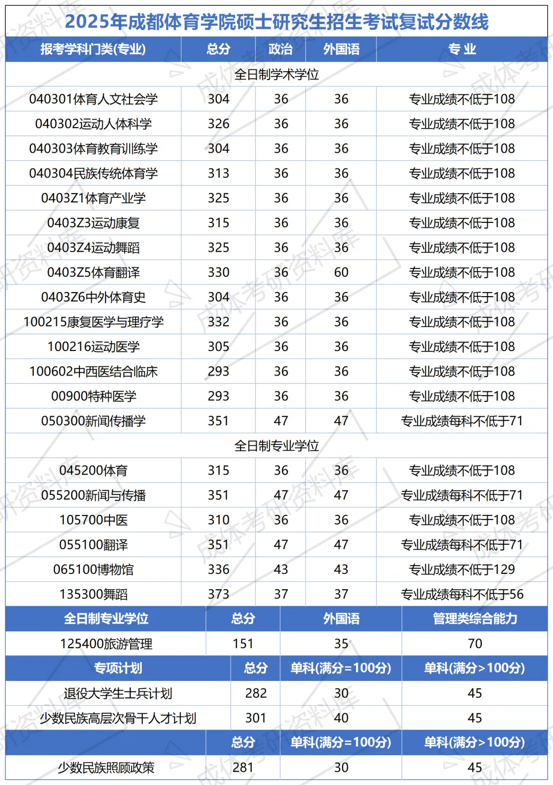 成都体育学院考研复试分数线汇总