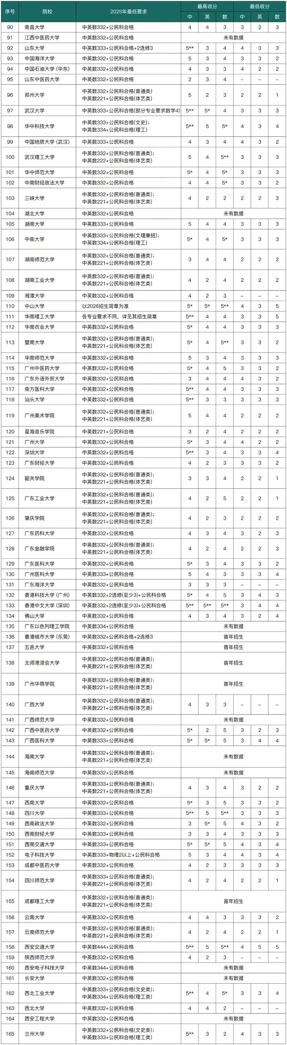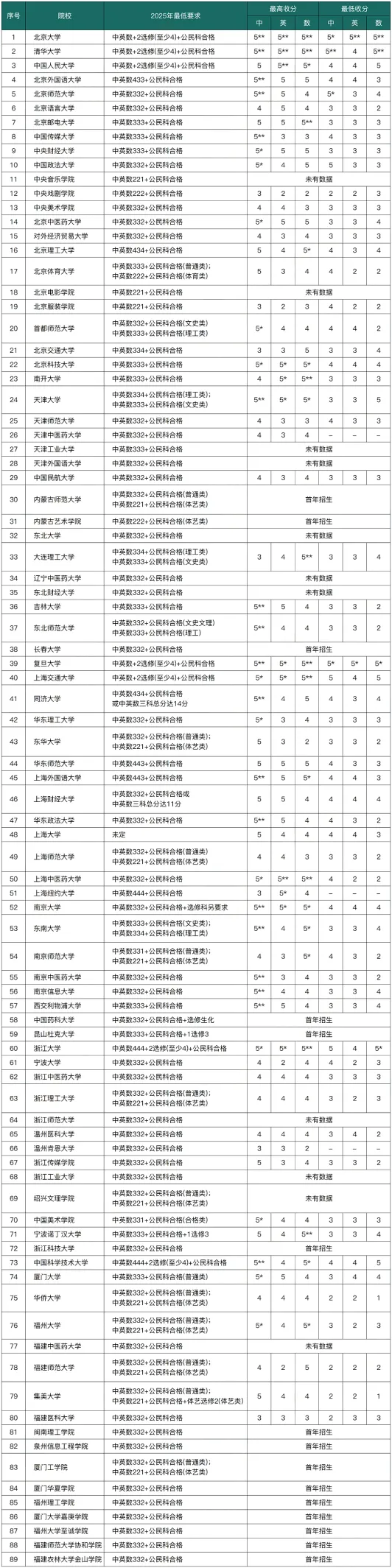 以下是内地高校DSE录取分数线要求(核心科目中文、英文、数学的最低要求):