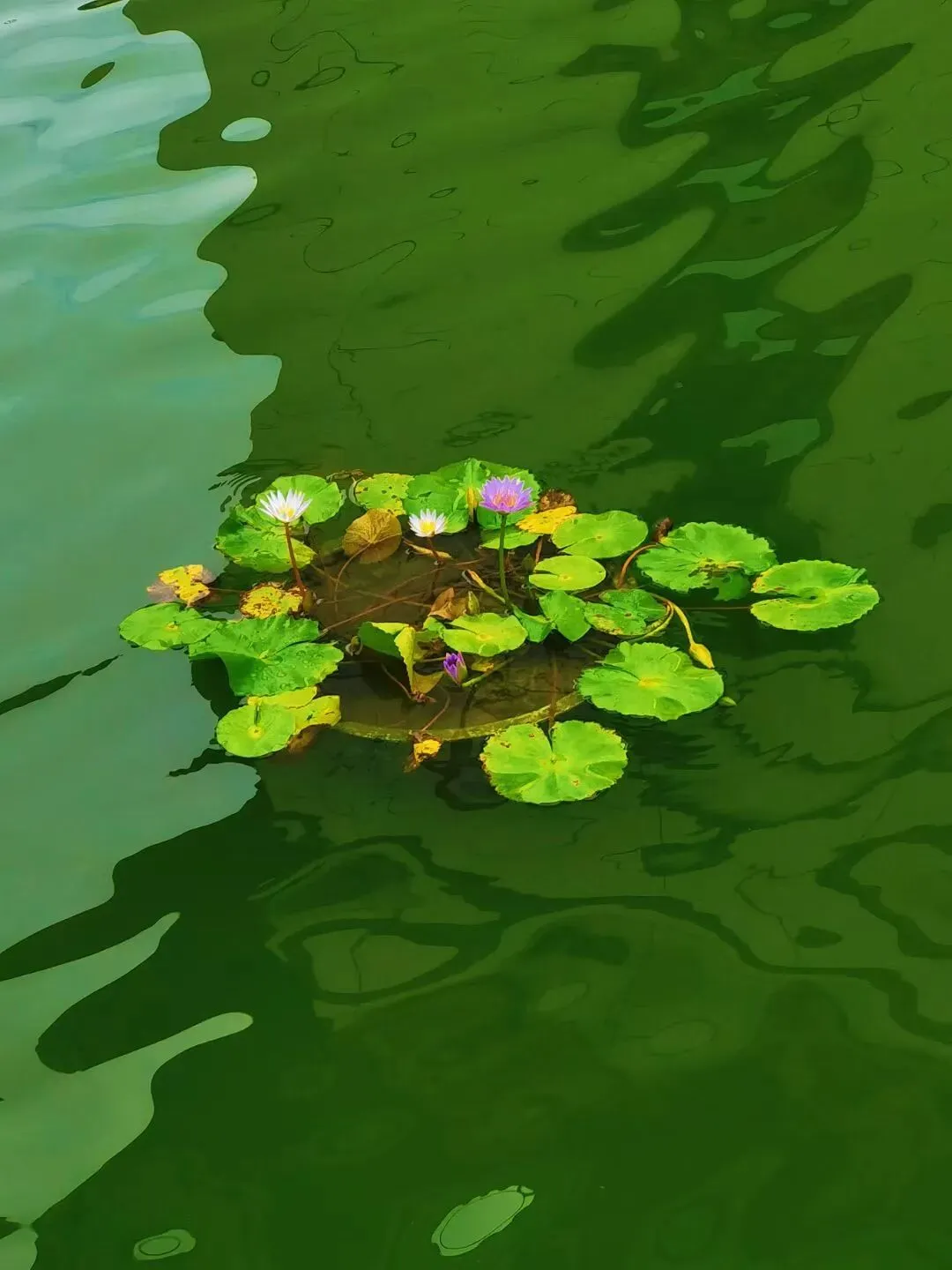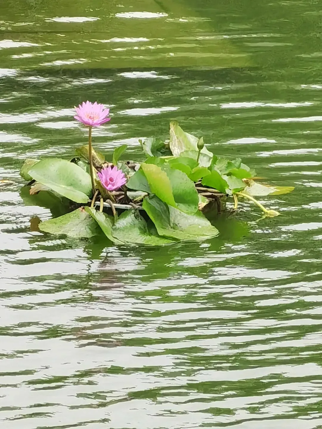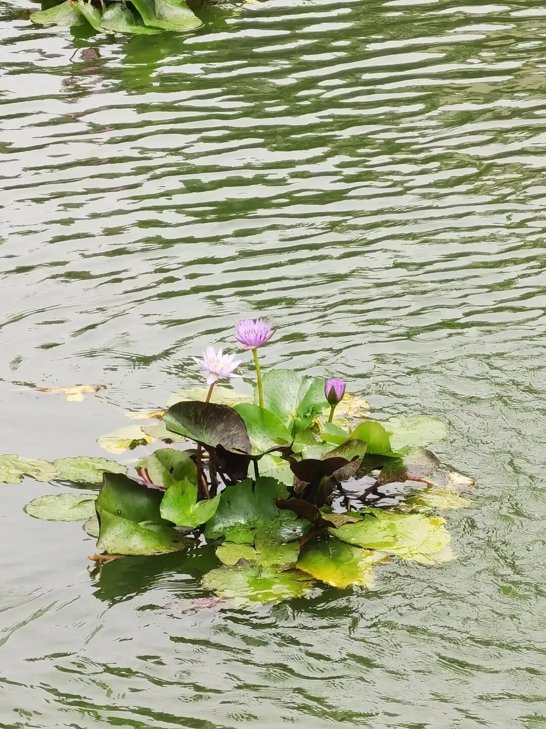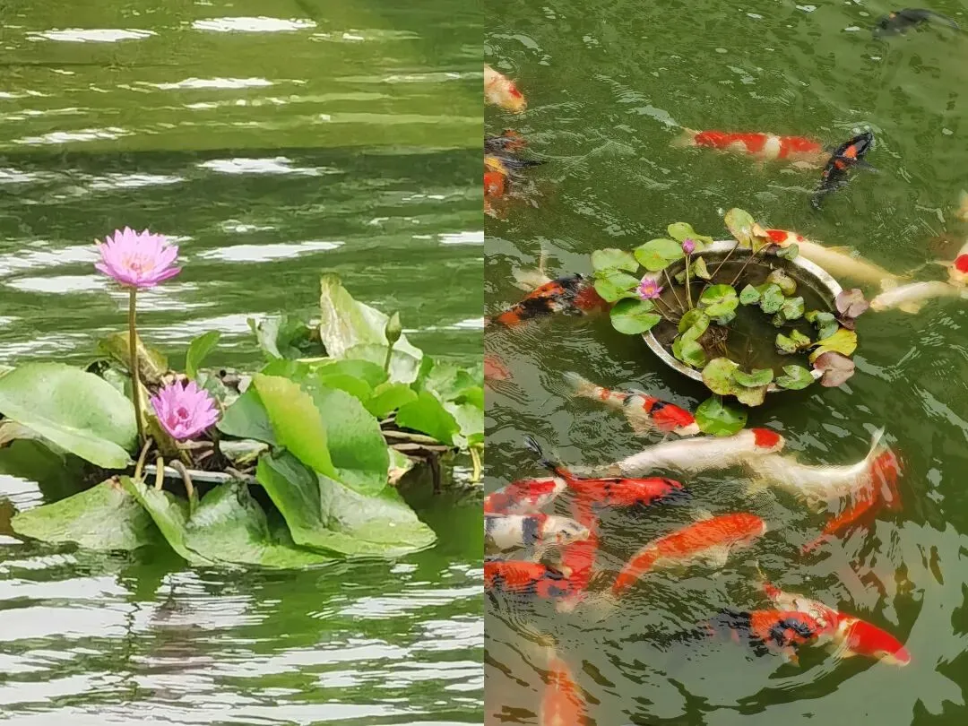 我每次去接小赵,都爱走到池塘边,边欣赏,边等她出校门。波光粼粼的水面,绿油油的叶子,娇艳多彩的花朵,嬉戏躲藏的锦鲤,一幅天然灵动的美丽画卷。研究表明,观察水生生物与植物可降低焦虑感(“亲生命性”理论)。在东方文化中,锦鲤代表吉祥、坚韧与机遇,“鲤跃龙门”也是学校对学生的美好祝福。睡莲与锦鲤,上进与上香,学生与考试,祝愿学子们都超水平发挥,交出更满意的答卷,加油!