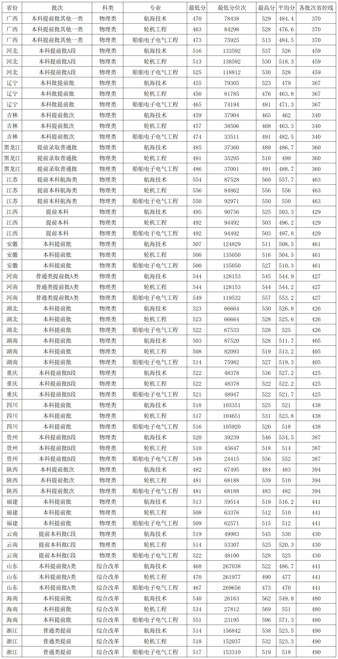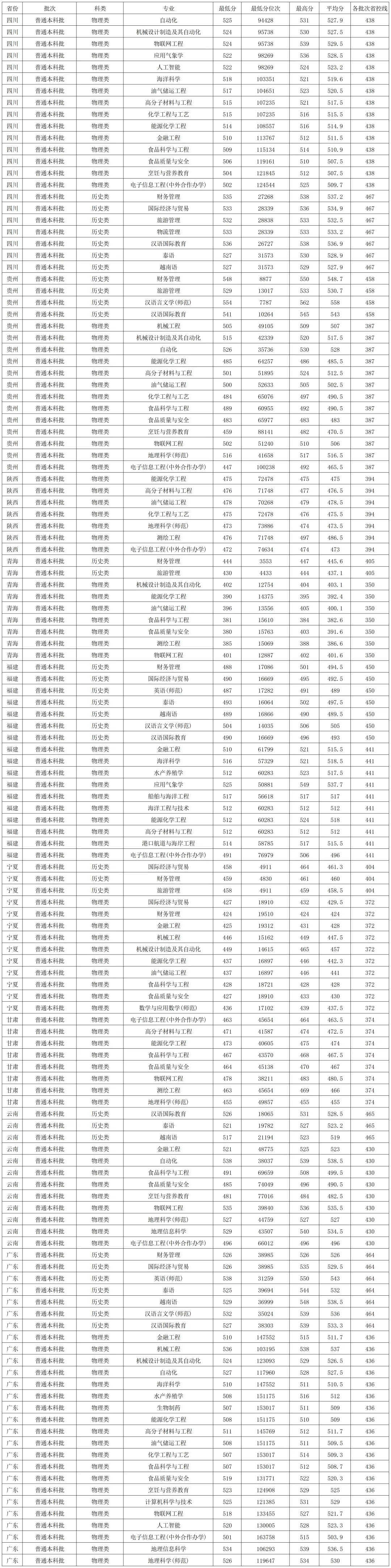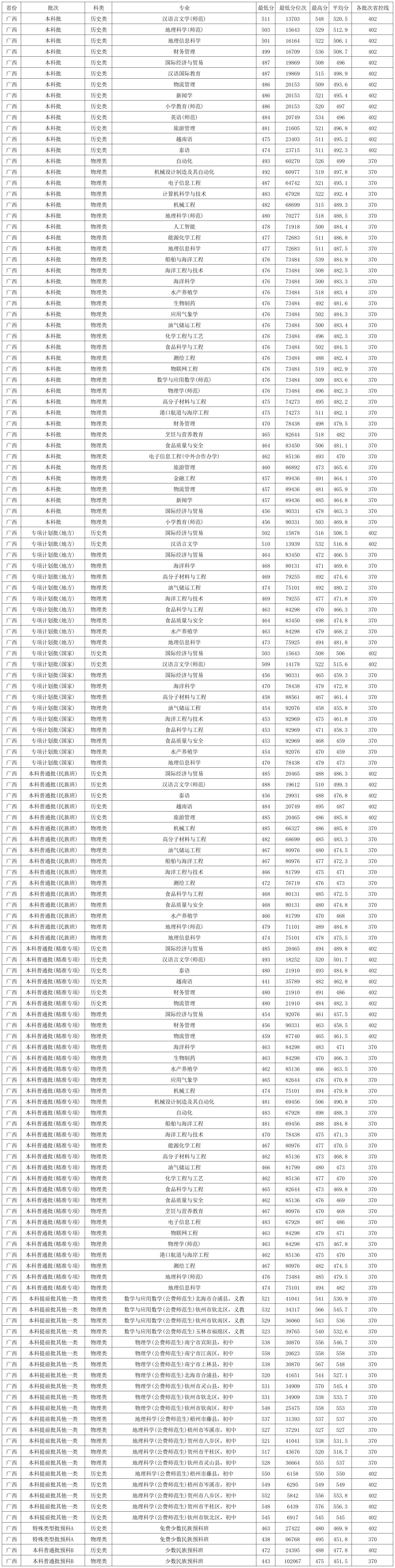 北部湾大学2025年本科提前批在各省各专业录取分数线
