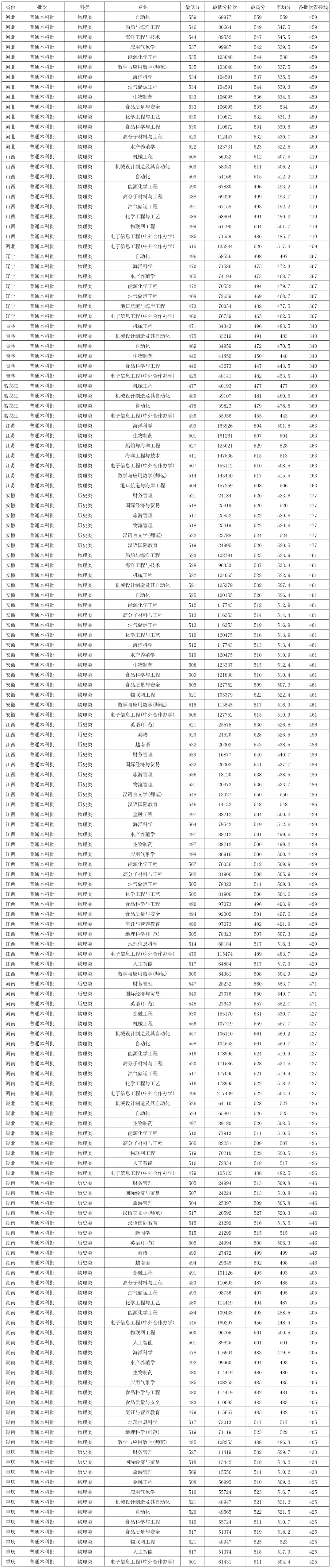北部湾大学2025年在河北本科批物理类录取分数线较高的专业:自动化559分、船舶与海洋工程546分、海洋工程与技术544分、应用气象学537分,最低的是水产养殖学522分,最低分位次123731。