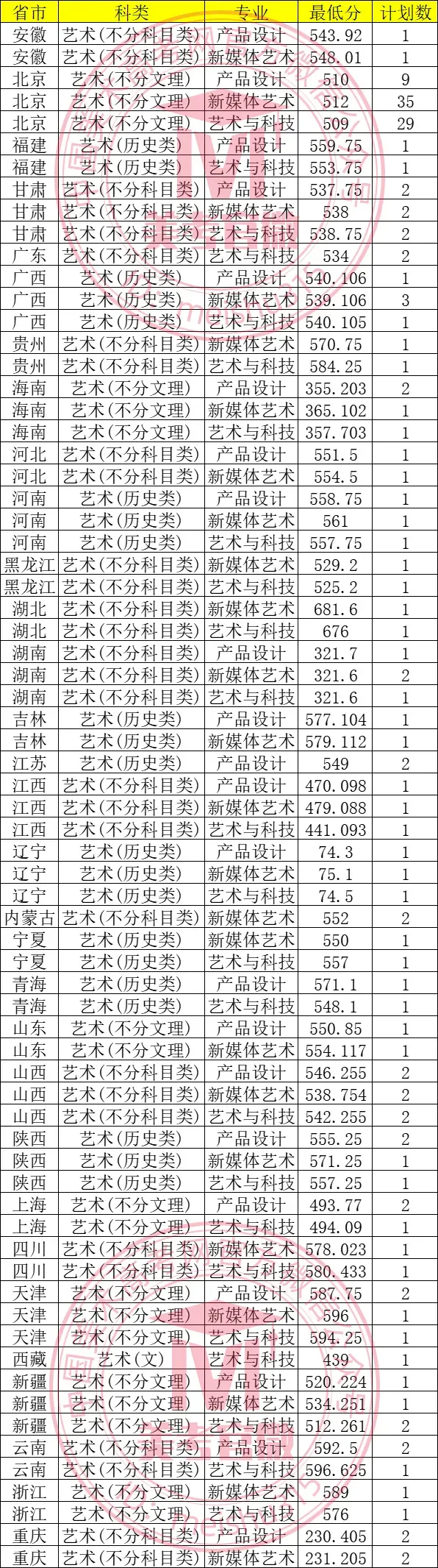 艺术与科技、产品设计、新媒体艺术3个专业不组织校考,对各项成绩均无特别要求,按照各省规定的平行志愿综合分录取。