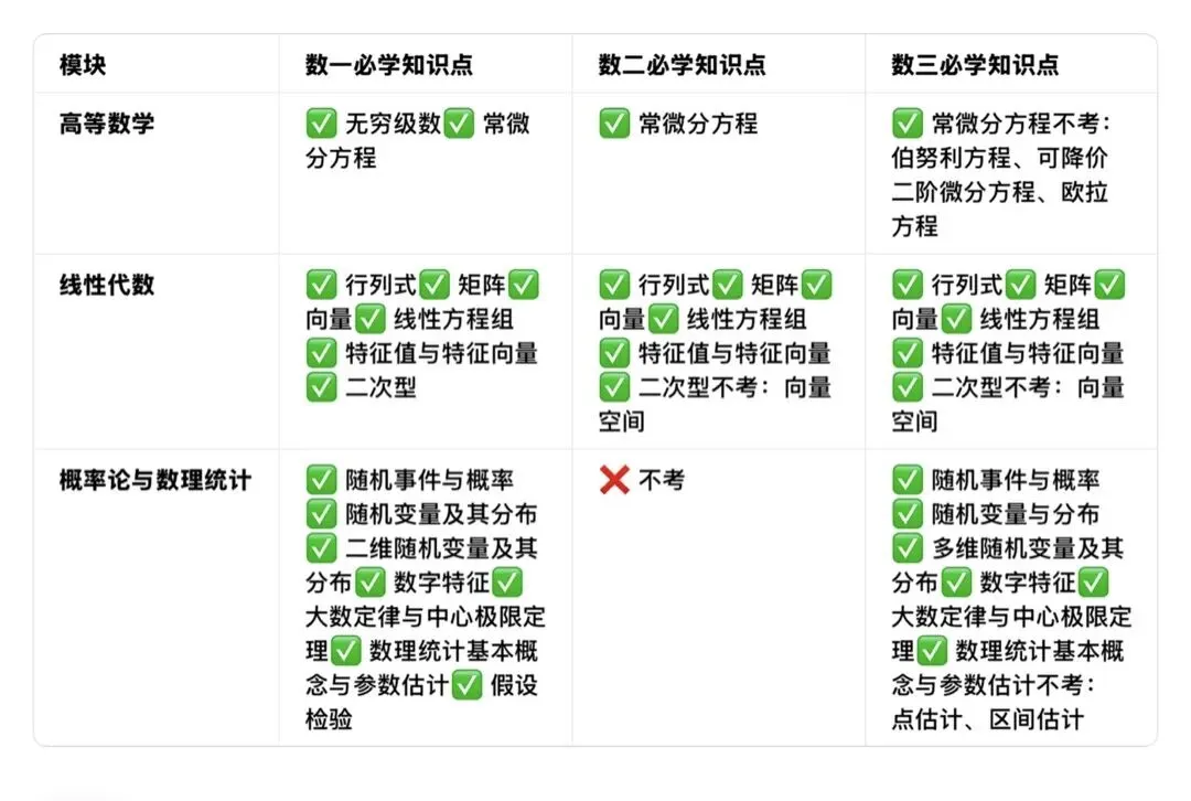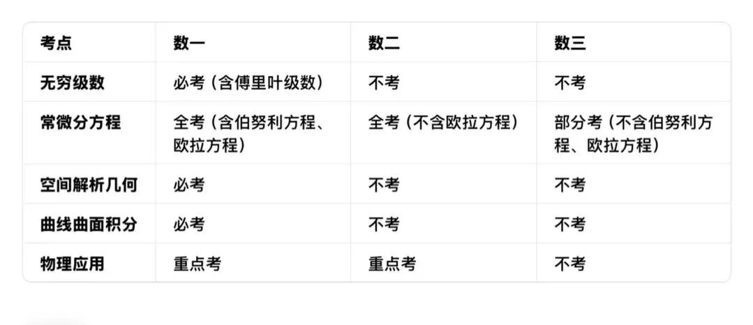 总结:数一、数二、数三内容差异小,但数一更侧重理论证明。