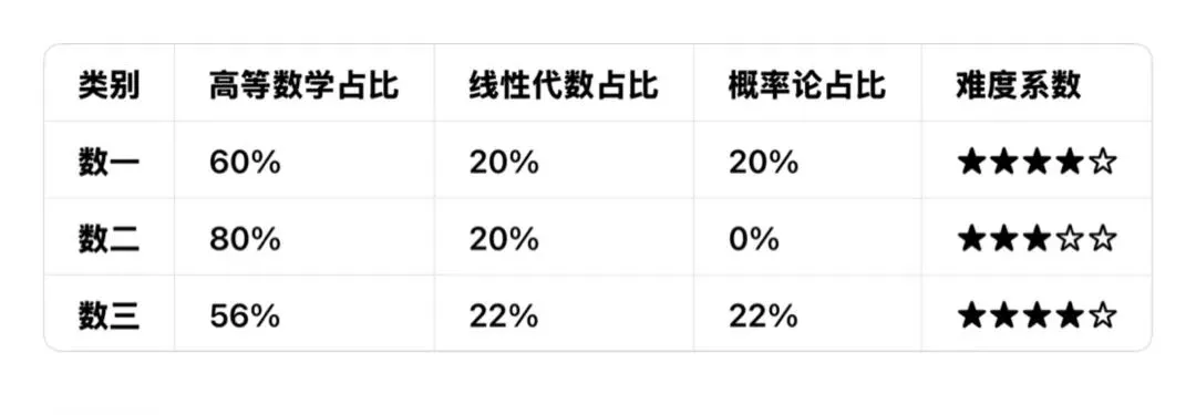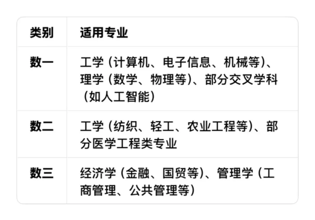 数一适用于理工科,考高数(60%)、线代(20%)、概率统计(20%),内容最全、难度最大;数二针对工科,不考概率统计,高数占比80%、线代20%,侧重计算;数三面向经管类,考三门但高数侧重应用,难度低于数一。