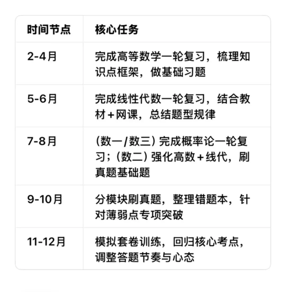 备考时,先明确目标专业对应的类别,数一/三需均衡发力,数二聚焦高数强化;真题至少刷近15年,数一/三注重综合题训练,数二多练计算熟练度,结合错题复盘薄弱点。