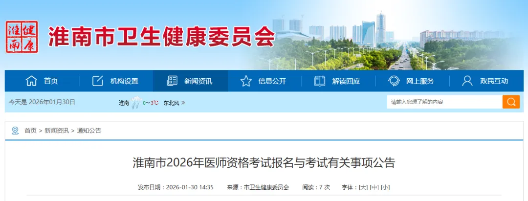 淮南市2026年医师资格考试报名与考试有关事项公告