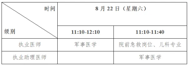 考试实行计算机化考试,军队现役人员、文职人员加试军事医学,院前急救岗位和儿科专业加试相应内容。统一考试时间如下: