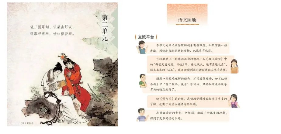 其次,小学高段,五年级下册第二单元,整个单元都在学习四大名著,儿童学四大名著的意义,不仅对孩子可以文化启蒙与语言熏陶,还能提升思维能力与品格塑造。五年级下册,单元篇章页专门用凝练的语言介绍四大名著;同时语文园地还总结了阅读名著的方法