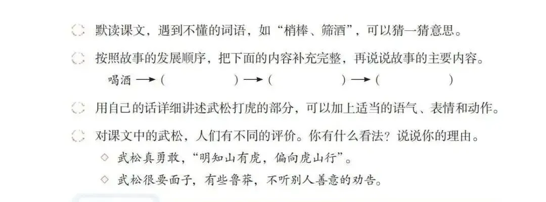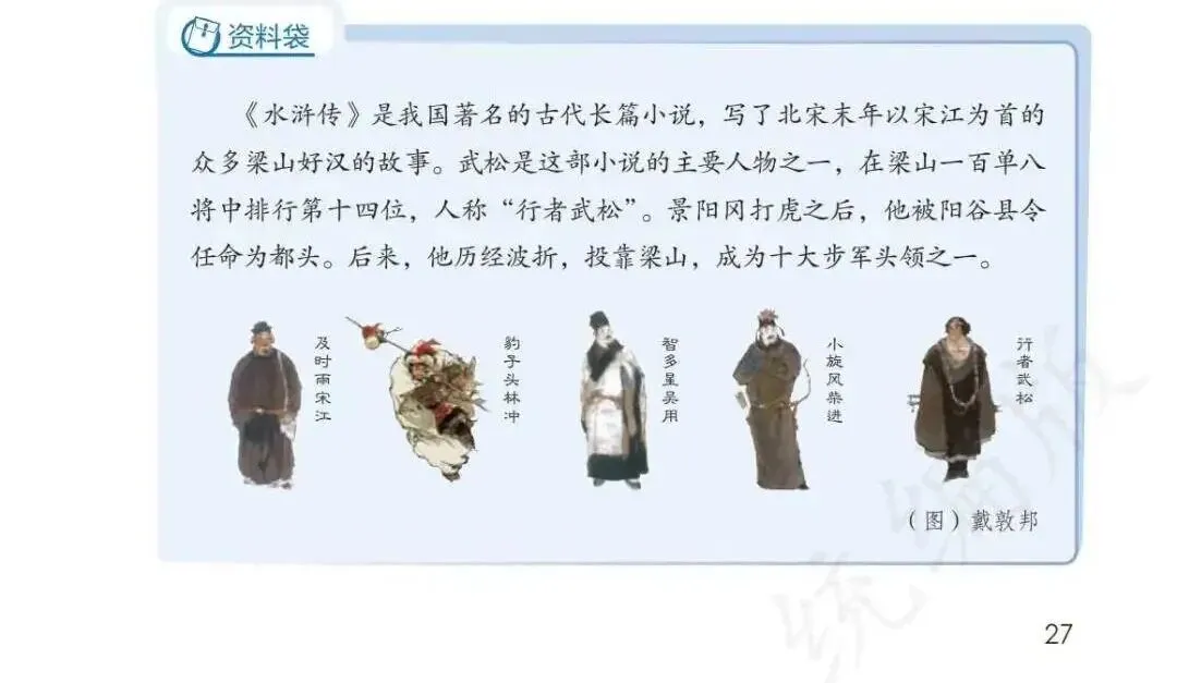 课本还给出明确导向:关于四大名著,那么多人物,如何把握?也是引导孩子阅读,记住核心人物,典型人物的名字与绰号一一对应,再了解一些他们的经典故事即可。
