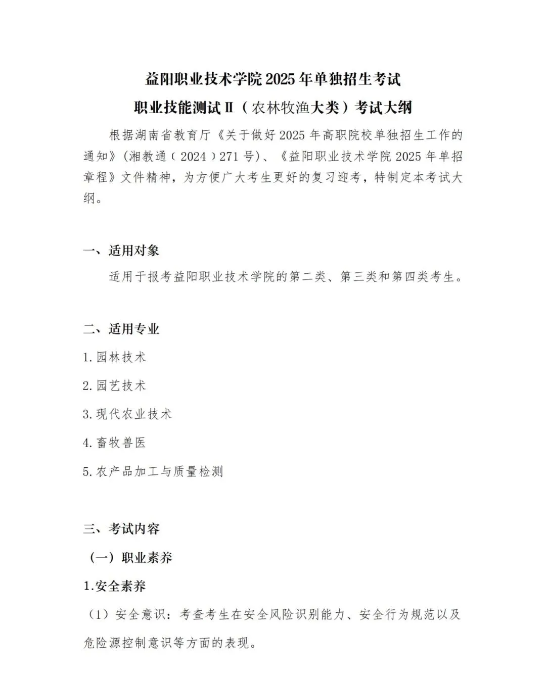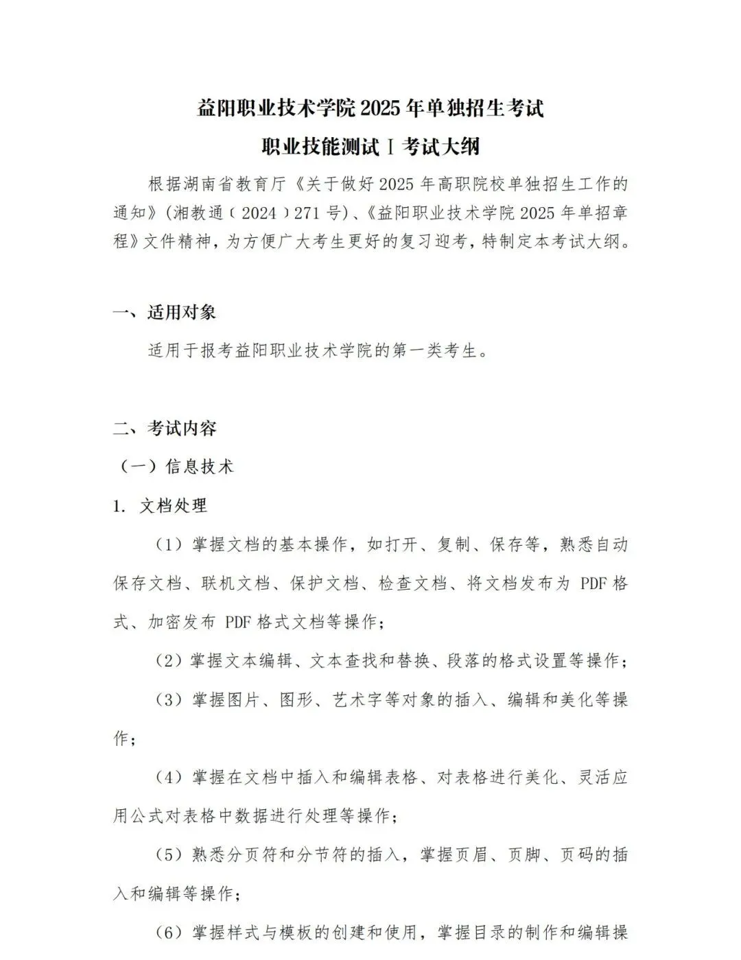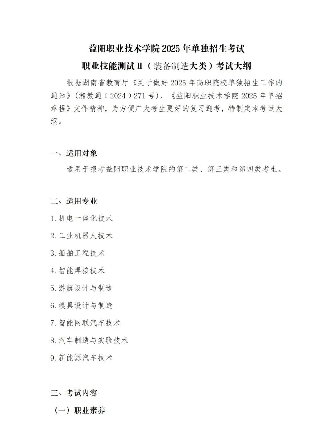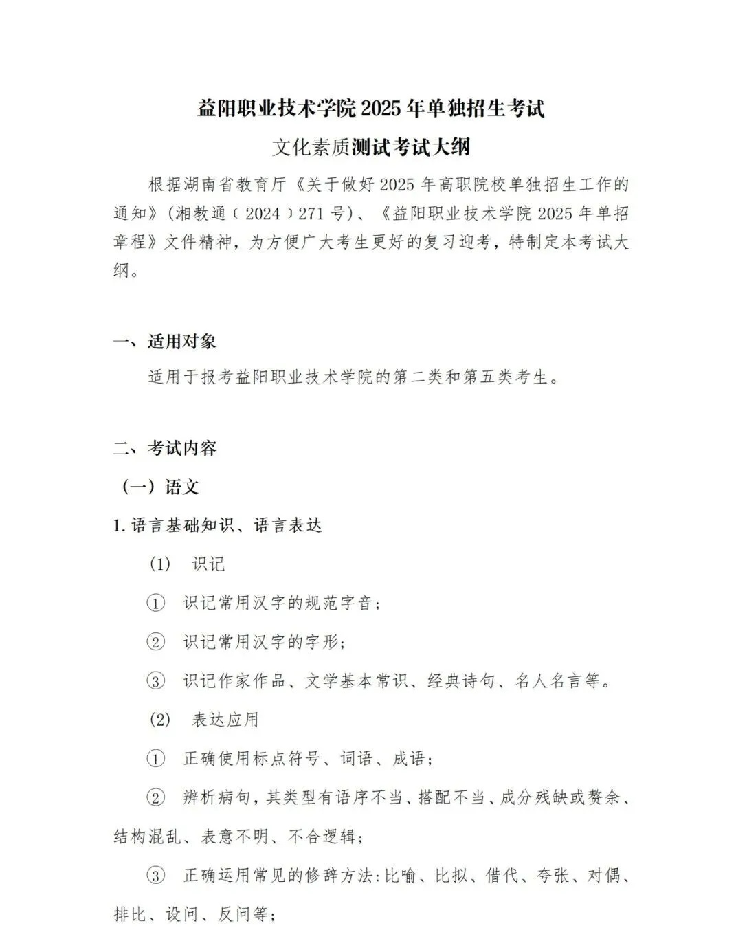 4.第五类:体育特长生。所有考生必须参加文化素质测试、职业技能测试。文化素质测试由学校依据《中等职业学校公共基础课课程标准》及高中教育阶段语文、数学、英语等有关内容进行命题及考试,采取笔试方式进行,满分300分。职业技能测试成绩以体育专项测试成绩代替,满分300分。体育专项测试按照《益阳职业技术学院2025年体育特长生高职单招方案》执行。