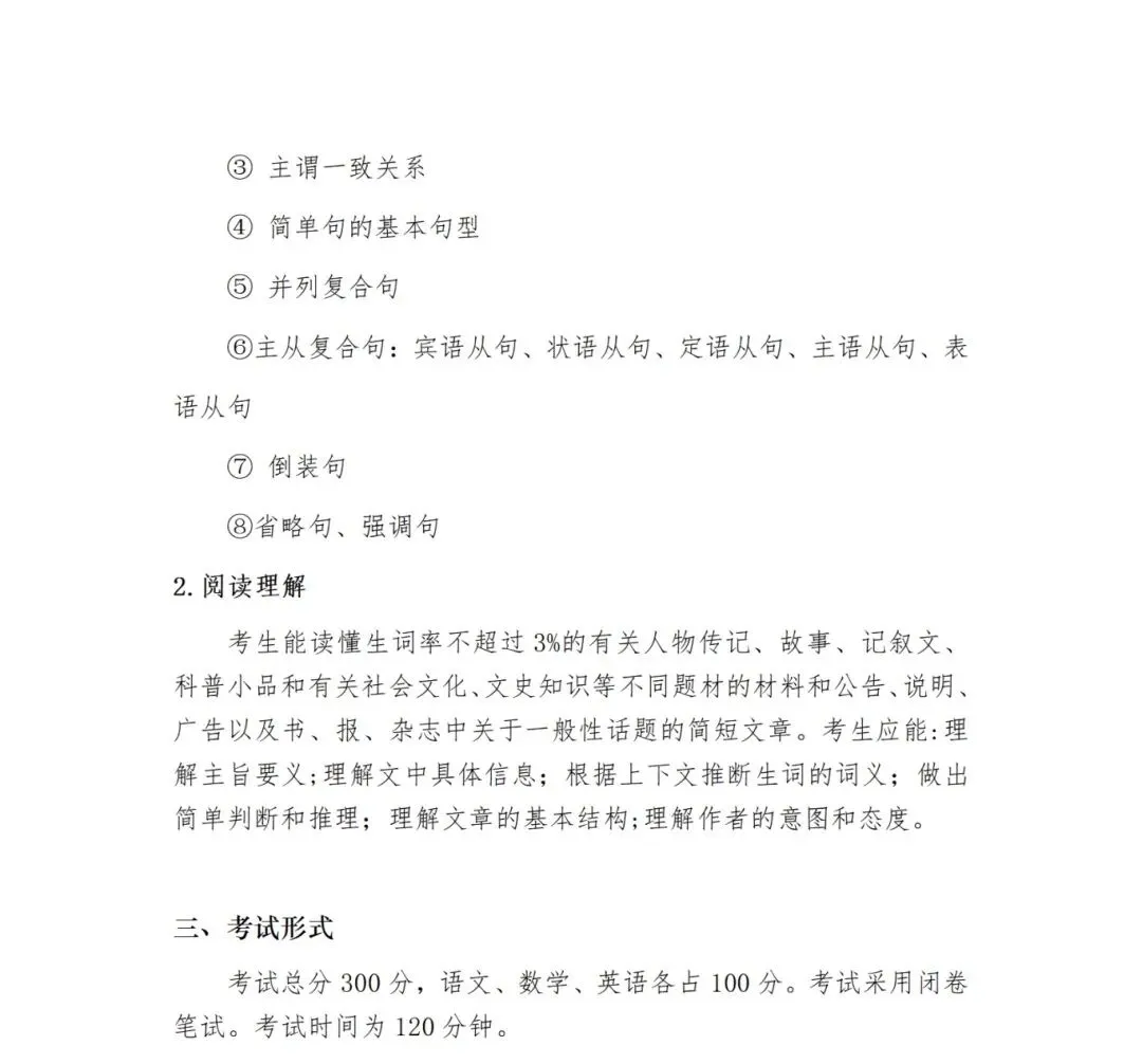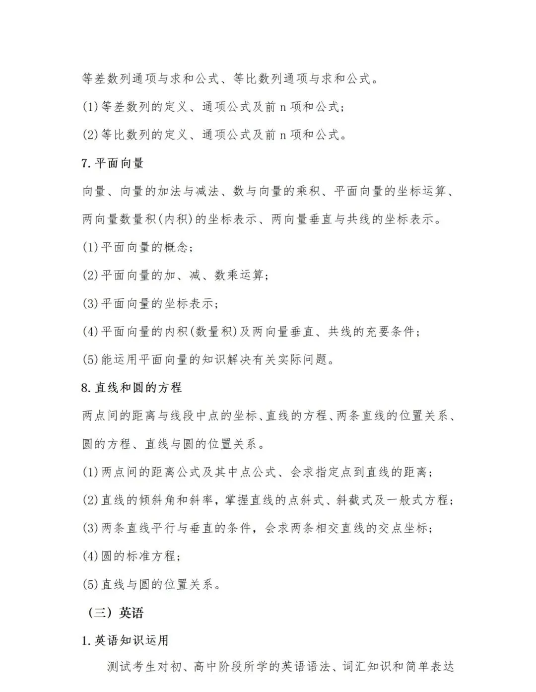 2.第二类:中职考生和往届普通高中考生及同等学力考生(含普通高中学业水平合格性考试科目语文、数学、外语三科有效成绩不全的应届普通高中考生)。文化素质测试由学校依据《中等职业学校公共基础课课程标准》及高中教育阶段语文、数学、英语等有关内容进行命题及考试。职业技能测试由学校组织,分别采取笔试方式进行,重点考察学生的职业技能。