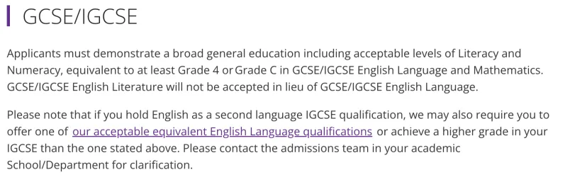 老师解读: 曼大要求同学们提供满足IG英语和数学C或以上等效的资历。国际生提供的ESL 成绩要高于他们上面写的最低线(建议和大学admission联系沟通确认)。
