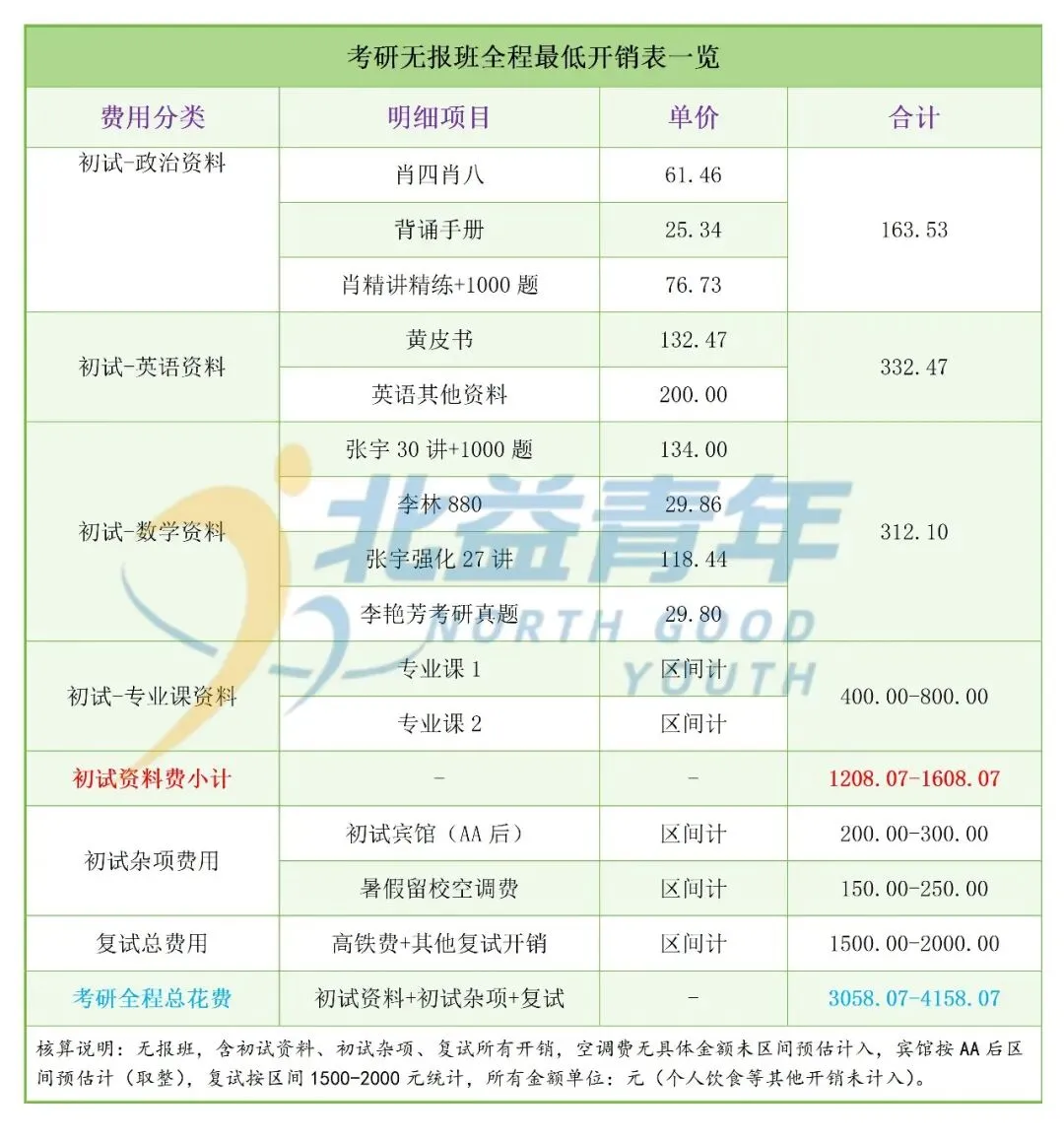 全程无报班的情况下,你的考研总花费控制在3000 -4000元左右(含复试大项高铁费),这个成本在考研中属于极低水平了!