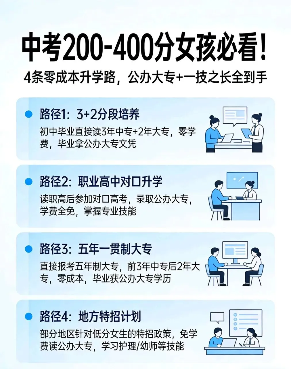 第一条路,适合中考200-400分的孩子:优先选当地县城或地级市的公办卫生中专、职业技术学院,报护理、医学相关或中医针灸专业,直接选3+2学制,前三年中专学费多有减免,后两年大专学费也极低,几乎不用花大钱。五年读完保底拿公办大专文凭,毕业后考护士资格证,再自考成人本科,以后去县城医院当护士稳定体面,特别适合女孩。