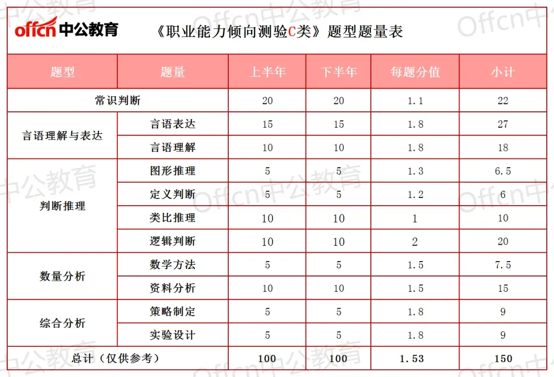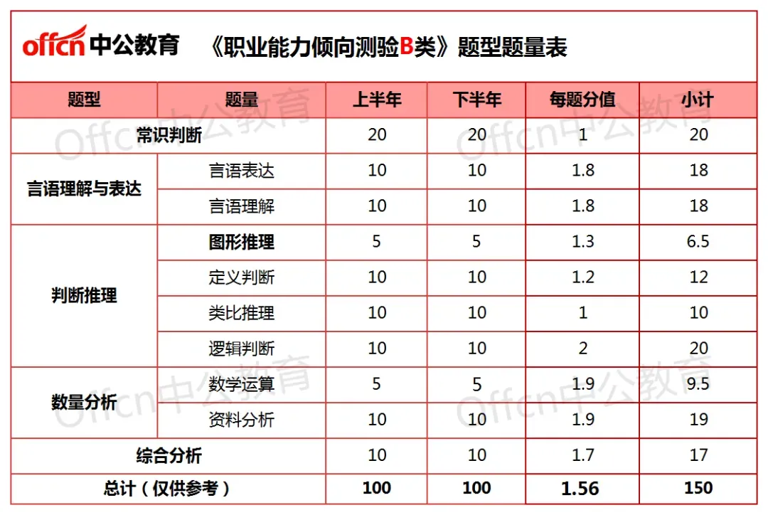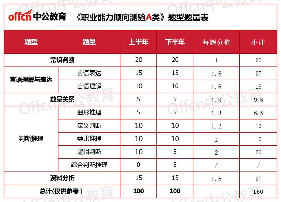 ⭐《职业能力倾向测验(A 类)》主要是针对事业单位管理岗位公开招聘工作人员而设置的考试科目,主要测查应试人员从事管理工作密切相关的、适合通过客观化纸笔测验方式进行考查的基本素质和能力要素,包括常识判断、言语理解与表达、数量关系、判断推理和资料分析等部分。