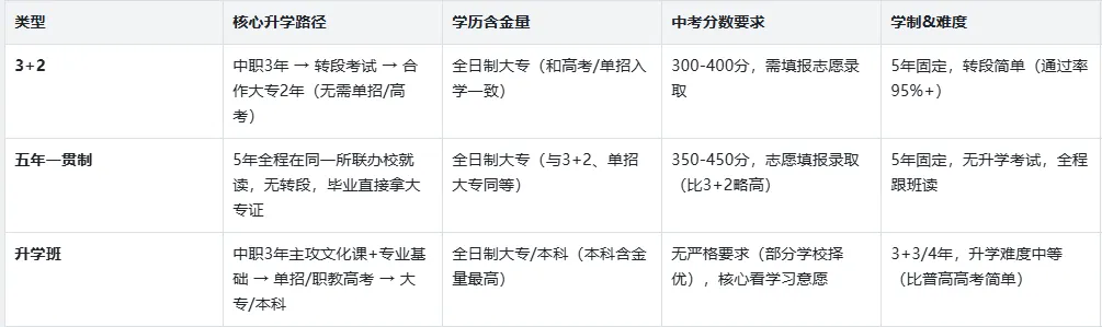 “孩子成绩没达普高线,3+2、五年一贯制、升学班都说好,到底该怎么选?”“怕选错学制,耽误孩子5年甚至更久;怕踩坑‘虚假贯通’,最后学历不被认可;更怕选的方向不适合孩子,要么跟不上进度,要么浪费潜力……”其实不用慌!这三种模式没有绝对的优劣,核心是“适配”——适配孩子的成绩、自律性,以及你们的未来规划(是想稳妥拿学历,还是冲刺本科,或是尽早就业)。今天就用最通俗的语言,把三种模式拆透,附避坑指南和精准匹配建议,初三家长看完直接对号入座,再也不被五花八门的宣传绕晕!很多家长误以为“3+2和五年一贯制都是5年拿大专,升学班就是另一种中职”,其实三者的培养目标、学习模式、升学路径,差异极大,先逐个摸清底细: