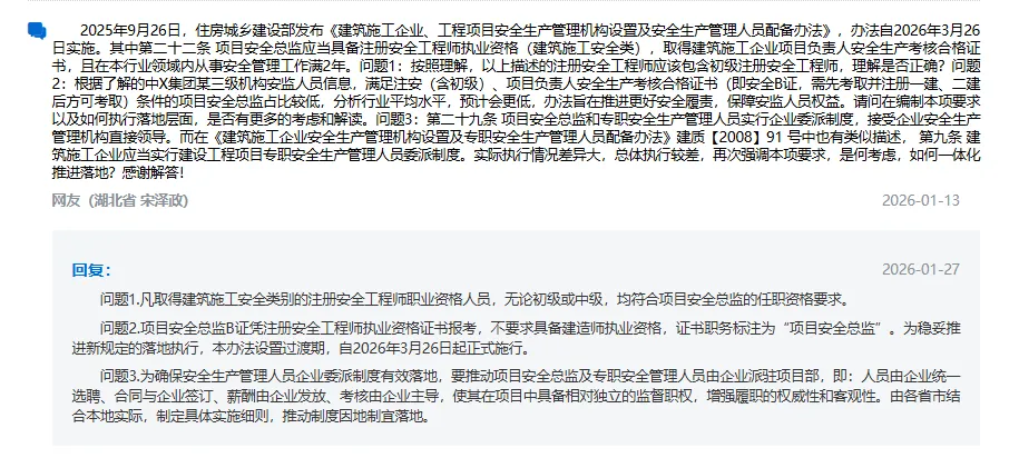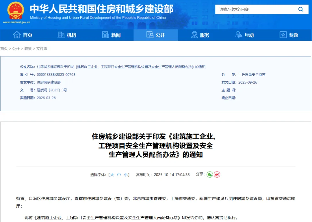 2025年9月26日,住房城乡建设部关于印发《建筑施工企业、工程项目安全生产管理机构设置及安全生产管理人员配备办法》(以下简称《办法》),此《办法》自颁发之日起满 6 个月后实施,即2026年3月26日开始实施。
