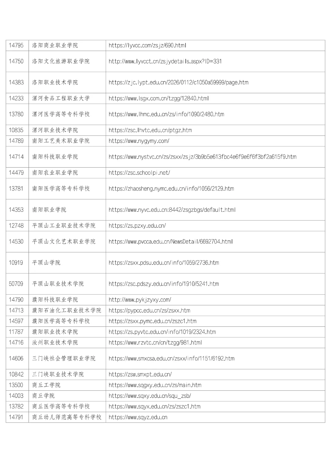 | 漯河医学高等专科学校 | https://www. lhmc.edu.cn/zs/info/1090/2480.htm | ||