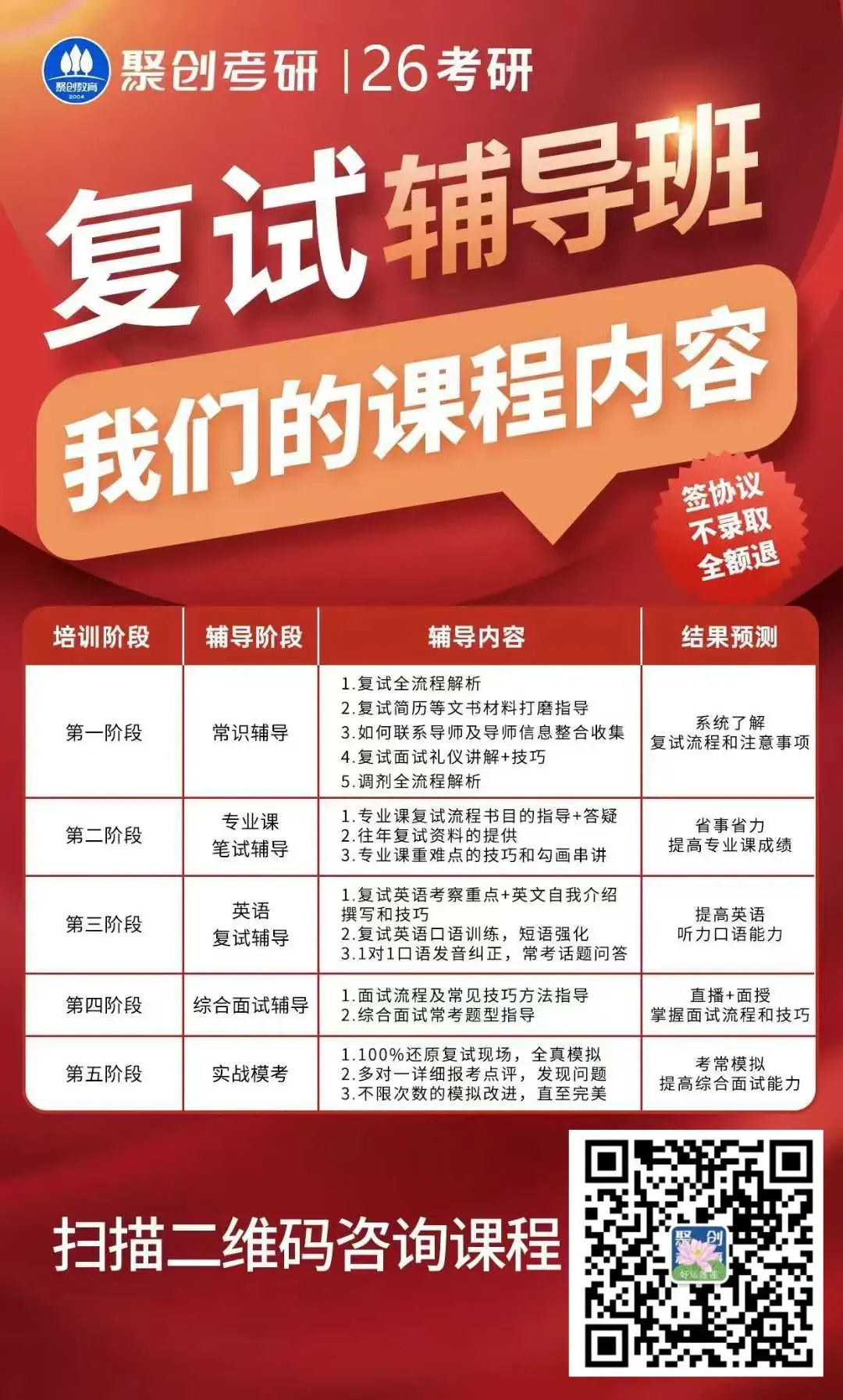全程辅导:从复试准备到复试结束,聚创考研复试班都会为学员提供全程的辅导和支持,确保学员在复试过程中能够顺利应对各种挑战。
