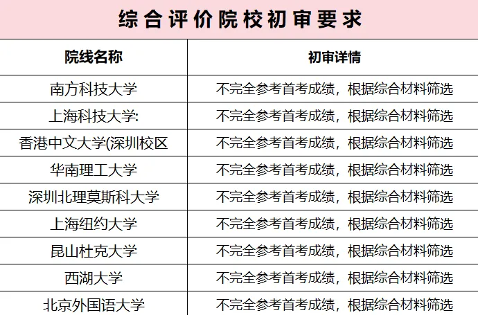 一般来说,综合评价院校的初审并不参考首考,有的首考380、390的考生就能通过,有的首考400分以上的考生却拿不到校测资格,综评院校更看重的是综合材料。因此,一定要重视个人综合材料的准备,增加通过初审的机会。