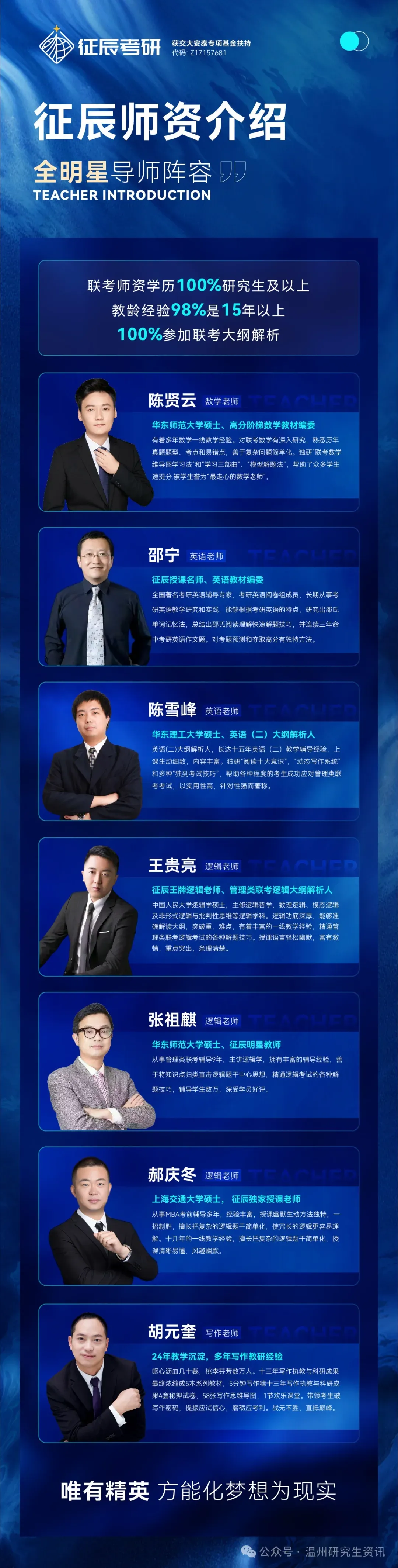 征辰教育,为了开辟一片广阔的管理类联考辅导蓝海,齐聚了全国尤其是江浙沪最优名师,课程讲解深入浅出,命题动态把握准确!旨在为学员提供最专业的管理类考研辅导!