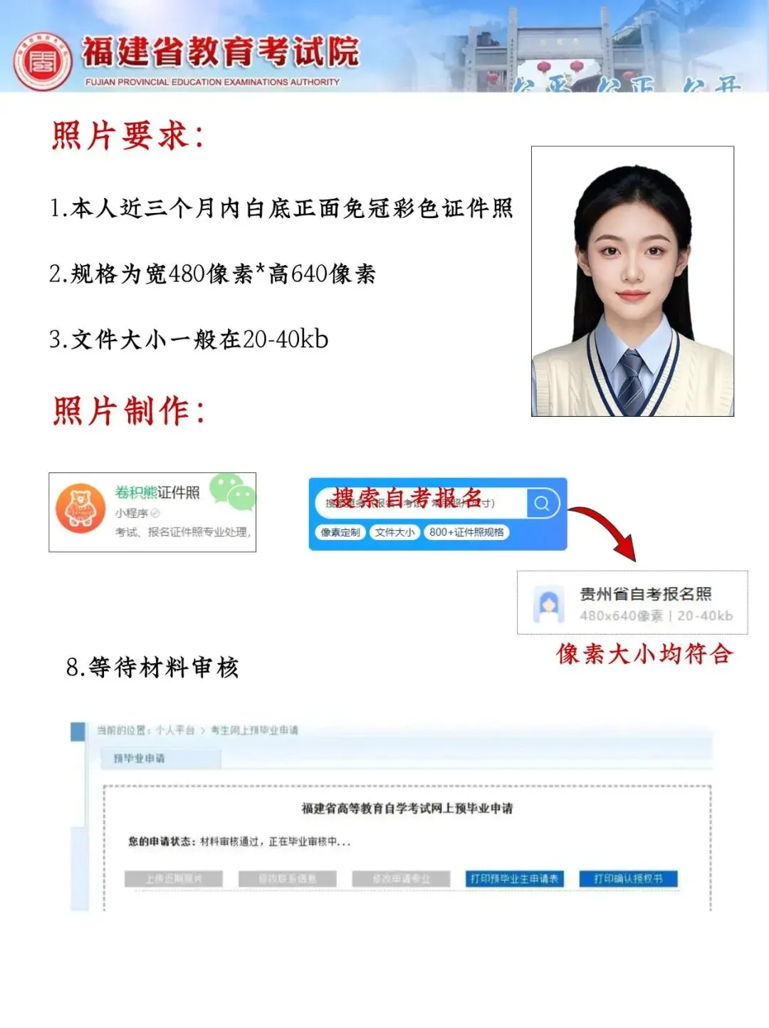 新生证件照要求:近3个月白底正面免冠彩色头像,480×640像素,别过度P图!