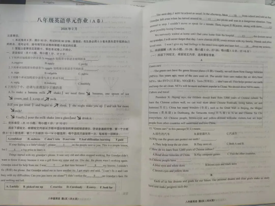 · 总分与结构:满分90分,考试时间90分钟。题型涵盖语音、完形、阅读、名著、语言运用、阅读表达、补全对话和书面表达,与期中考试结构基本一致,考查全面。