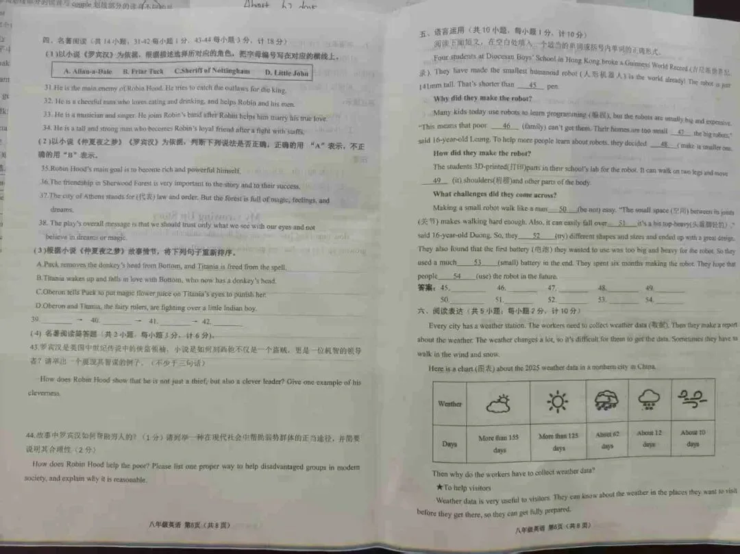 · 简答题:难度大,区分度高。43题要求用英语概述罗宾汉的智谋并举例,考查信息提取、概括与英语表达能力。44题第一问为基础,第二问链接现实,要求提出帮助弱势群体的正当途径并说明理由,考查迁移应用与批判性思维,是试卷的亮点和难点。