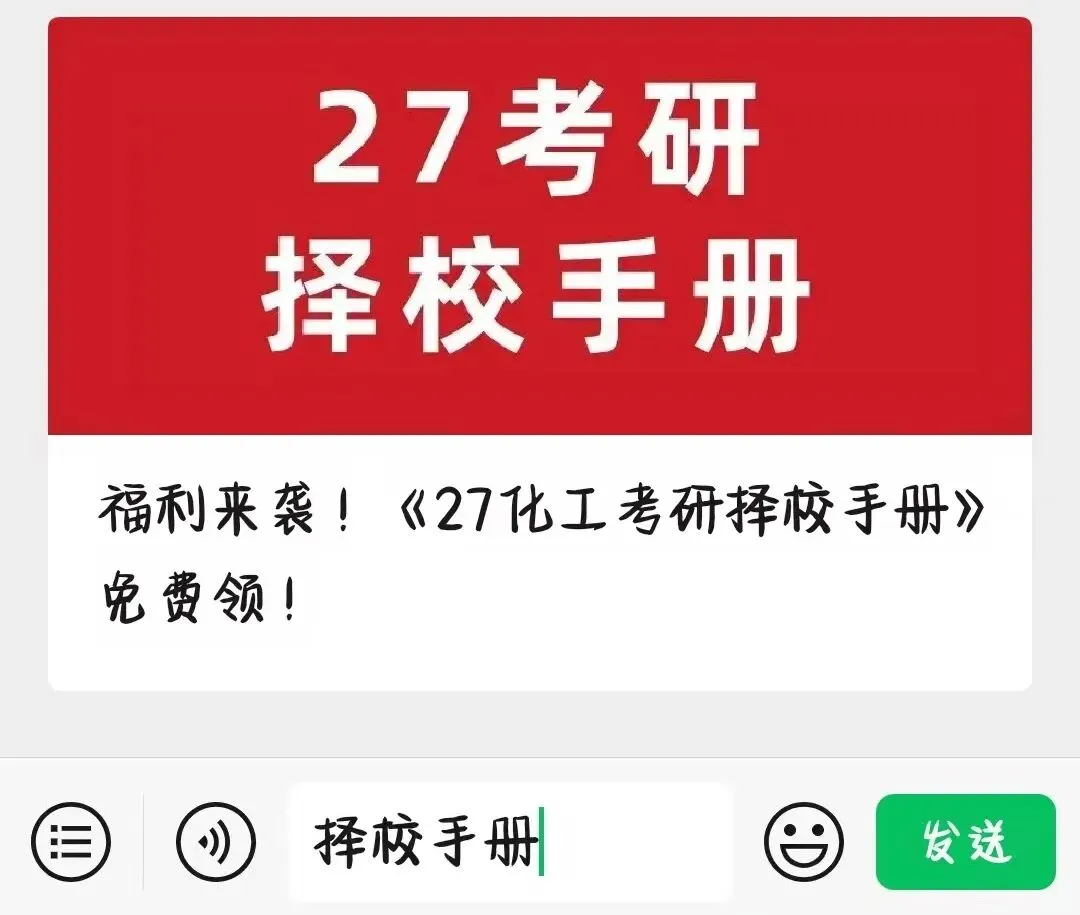 此次《27化工考研100+所院校择校指导手册》免费分享给大家,在公众号后台回复:择校手册,即可免费领取。