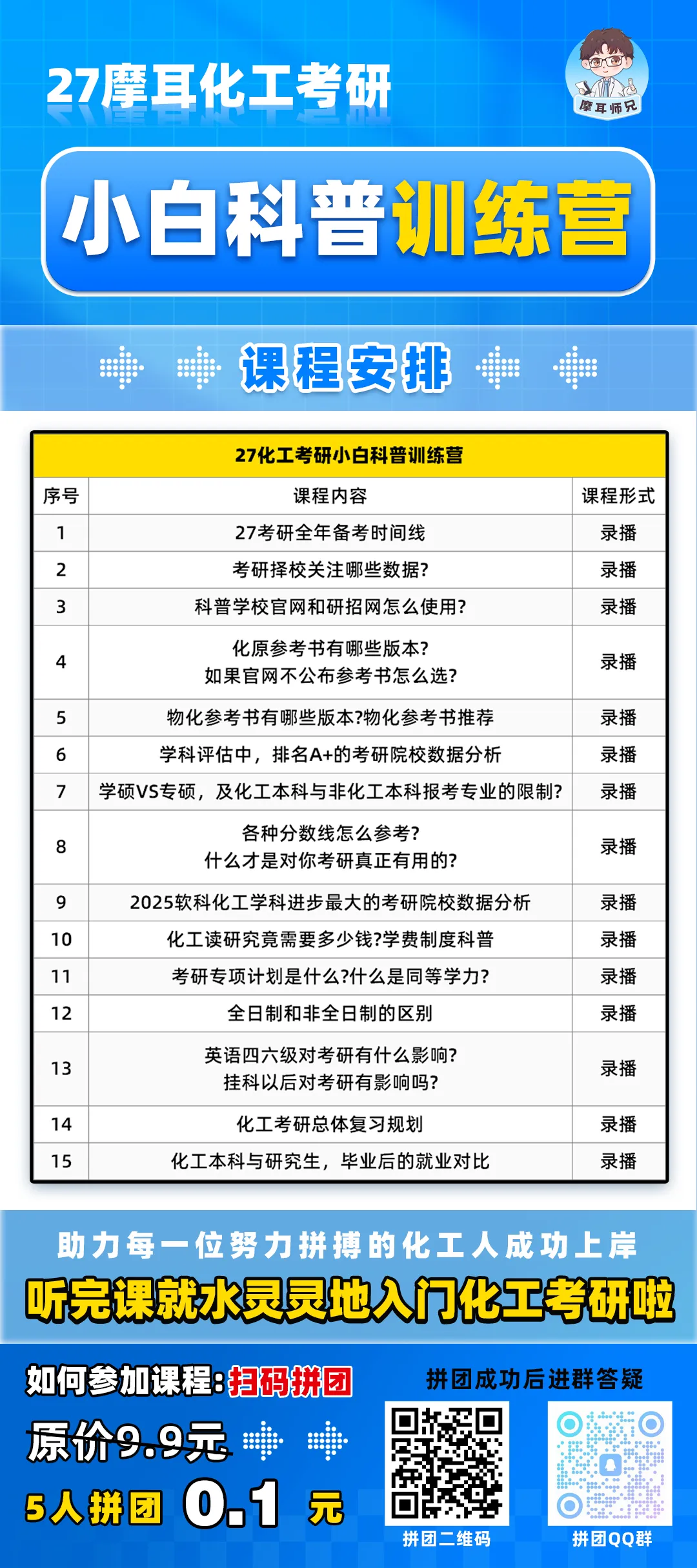 除了 27化工考研择校手册 外,我专门针对化工考研做了信息分流筛选,开设了15节化工考研科普课程——「27 化工考研小白科普训练营」