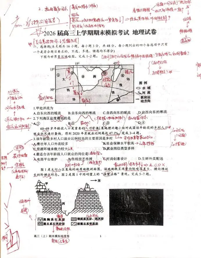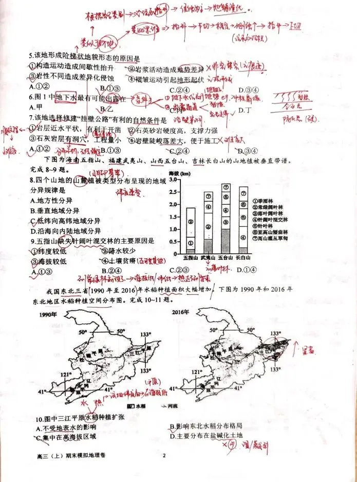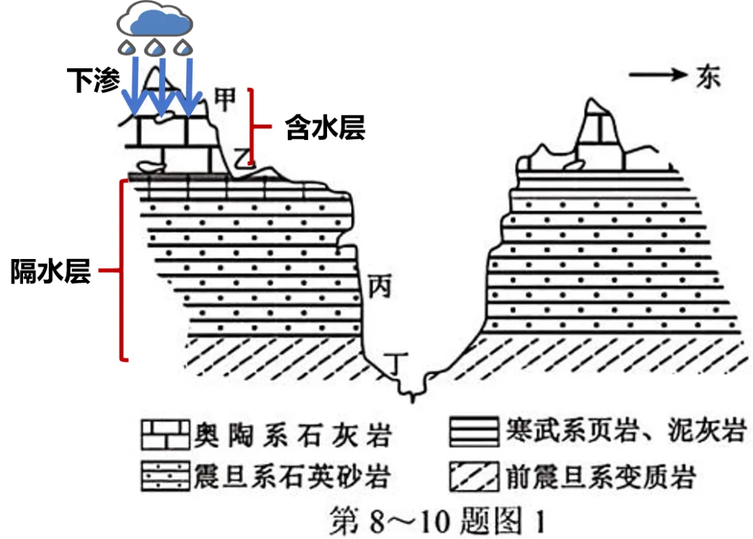 (1)第6题,地下水出露的条件——①地下水位高于地势(eg.冲积扇缘);②出露通道eg.裂隙