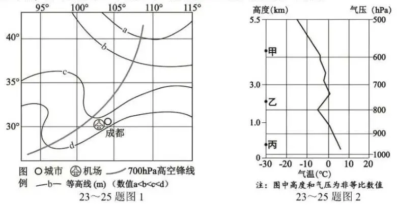 试题材料:某年12月23日20时,一架由北京直飞成都的航班降落机场。图1为20时700hPa等压面的等高线分布图,图2为此时机场垂直上空气温变化曲线图。完成14~16题。