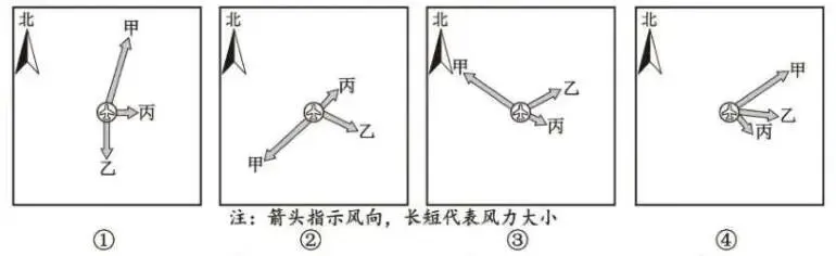 16.航班降落时,机场上空甲、乙、丙三处风向垂直投影最接近的是