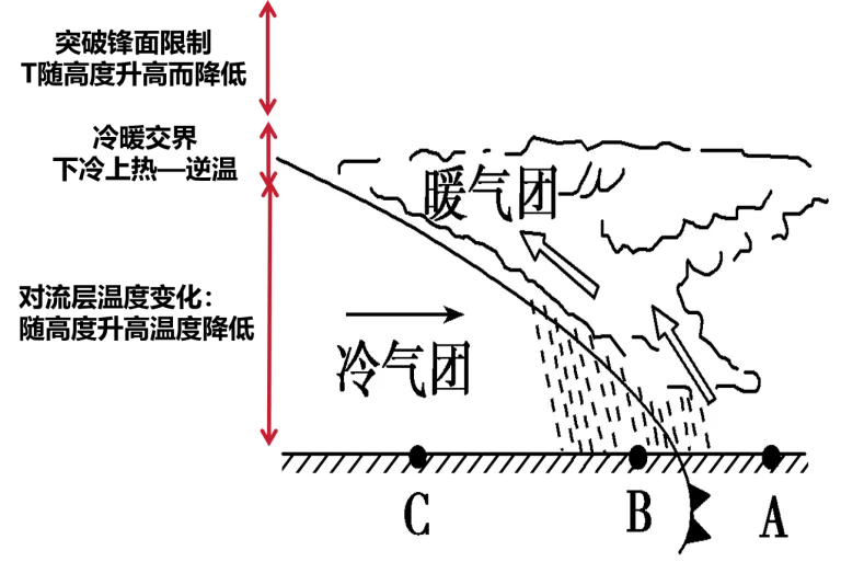 由此可知,近地面向上会经过逆温层即经过冷暖气团交界,符合图示气温变化,故位于冷锋锋后。