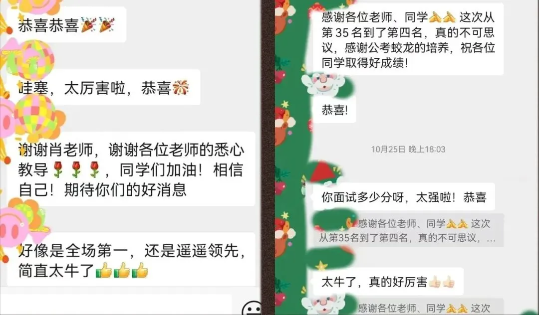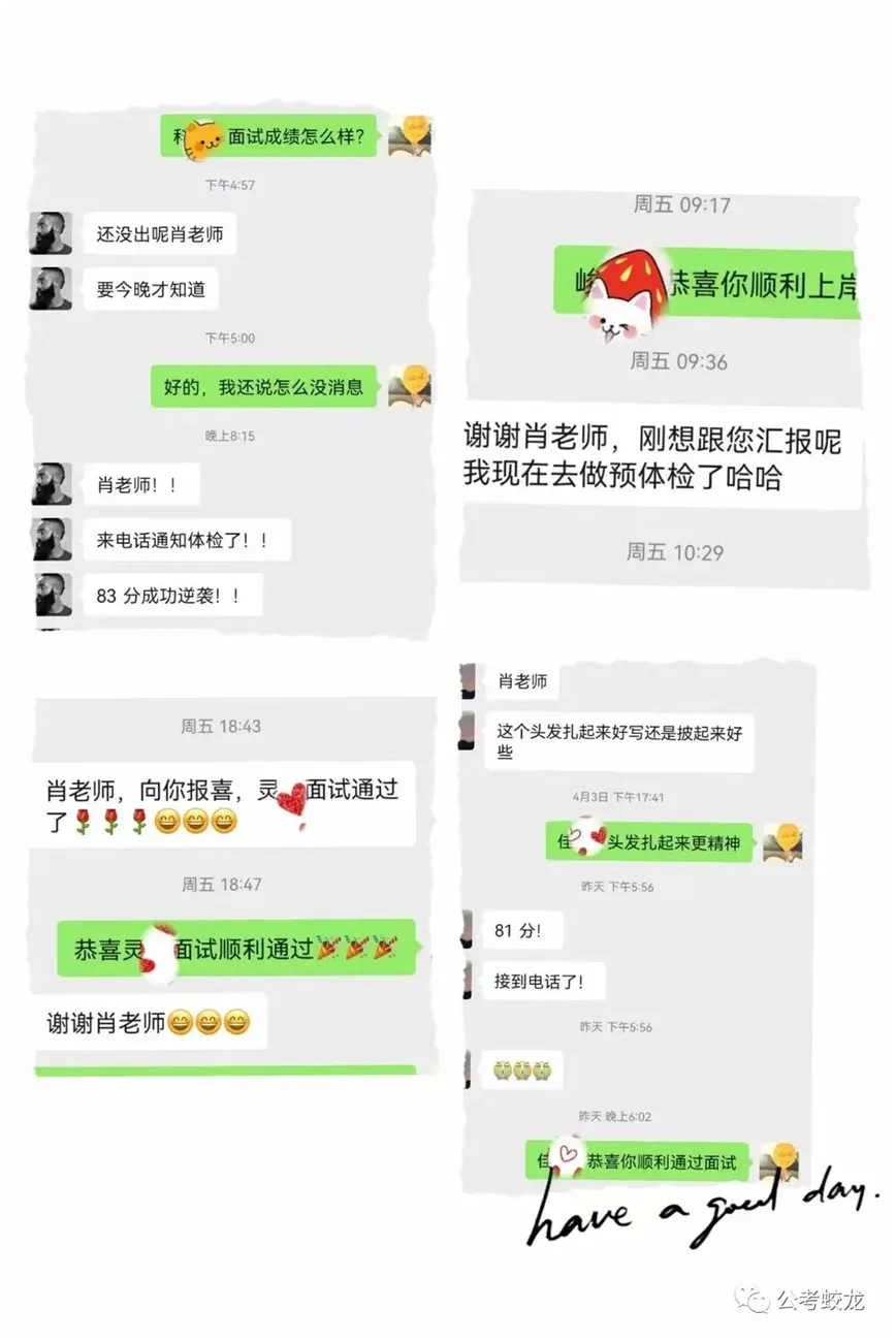 近5年来,公考蛟龙学员国考、省考面试守擂率100%,逆袭率60%左右,总体过关率81%,创造了公考培训的神话。2023年国考税务面试班上岸率100%,2025年国考面试班多位学员斩获高分佳绩。