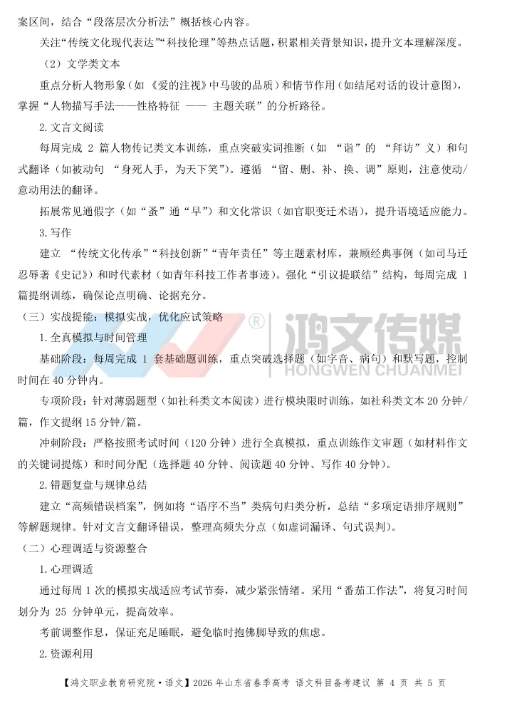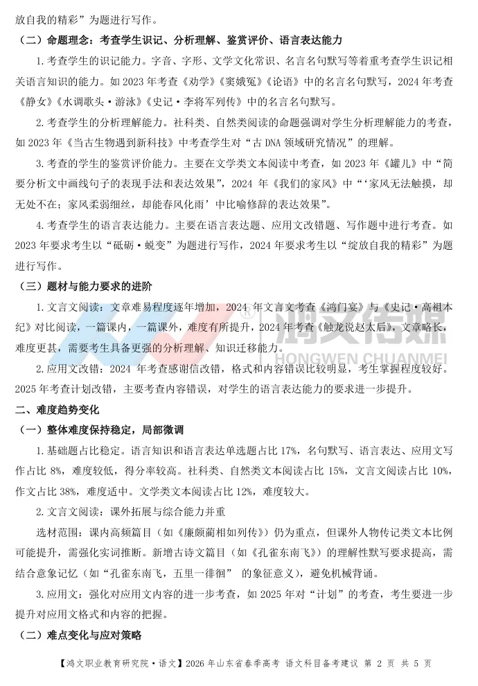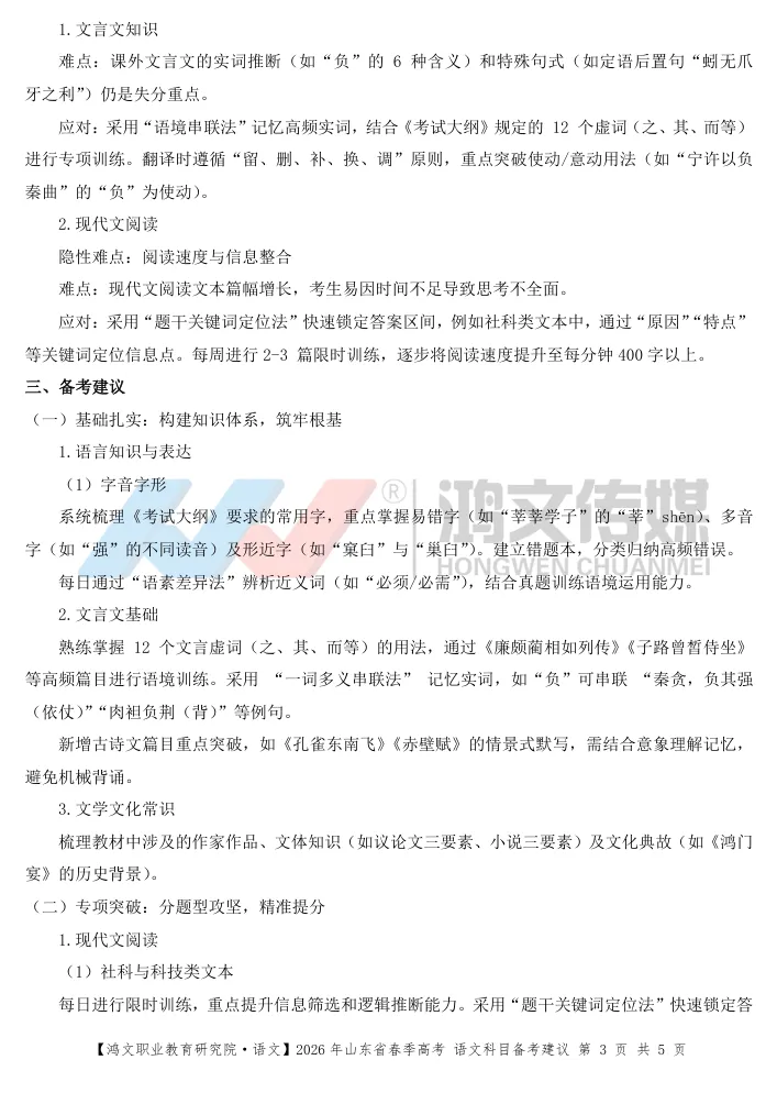 2026年山东省普通高校招生春季高考知识考试进入了倒计时,你或许因为知识点不熟练,对考点要求掌握不到位而感到迷茫,为助力全省广大考生高效备考,鸿文职业教育研究院对山东春季高考语文知识考试试题进行备考梳理,备考建议,以及往年考题方法的总结,欢迎广大学校及考生学习使用。