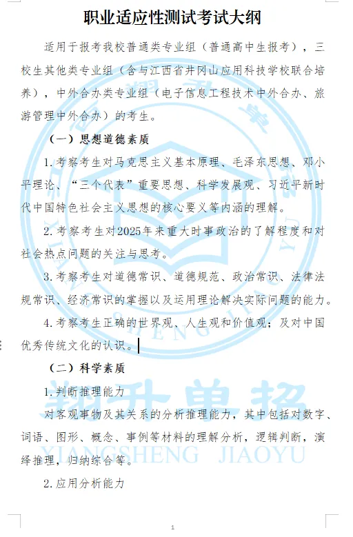根据《关于做好全省2026年高等职业教育单独招生考试工作的通知》(赣教考字〔2025〕24号)文件精神,江西省2026年高等职业教育单独招生实行“文化素质全省统考+职业技能(或职业适应性)测试校考”模式。为帮助各位考生高效备考,现公布我校2026年单独招生职业技能(或职业适应性)校考考试大纲。请各位考生根据考试类别,仔细查阅对应大纲内容,合理规划复习。