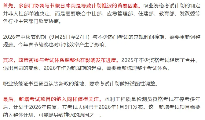 2026年已进入2月,往年通常在1月上、中旬公布的年度专业技术人员职业资格考试计划至今尚未发布,这打破了近十年的发布惯例。这一延迟让众多备考职业资格证书的考生心生焦虑。