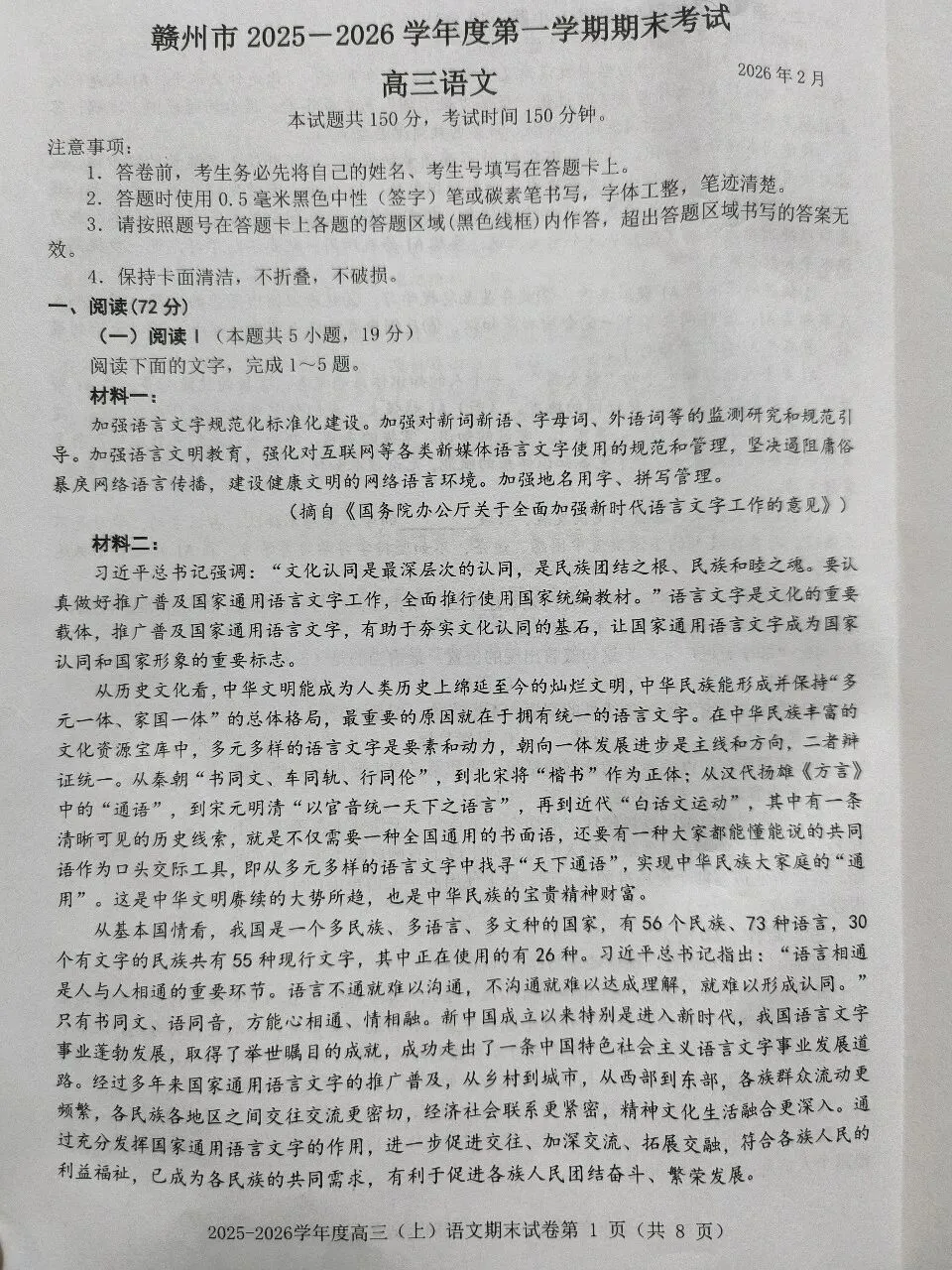 赣州市2025-2026学年度第一学期期末考试