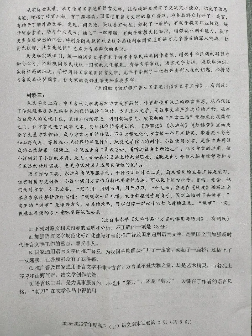 3.C(语言使用不够规范与标准:“说说”“土话”为口语,缺乏学术严谨性。)