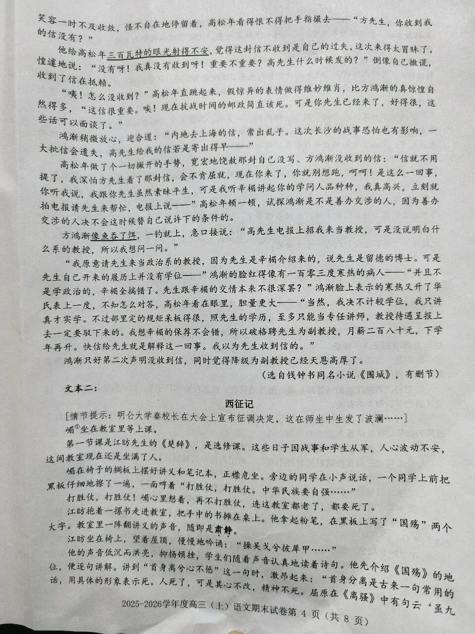8.⑴招数:①采取欺骗的方法,骗说已写了信给方鸿渐,还骗说信颇重要,以此让方鸿渐处于被动;②摆出方鸿渐没有学位的事实,让方鸿渐难堪无奈,最后被迫接受。(2分。如果写到“试探”“软硬兼施”等词语,只要合理,也可给分。)