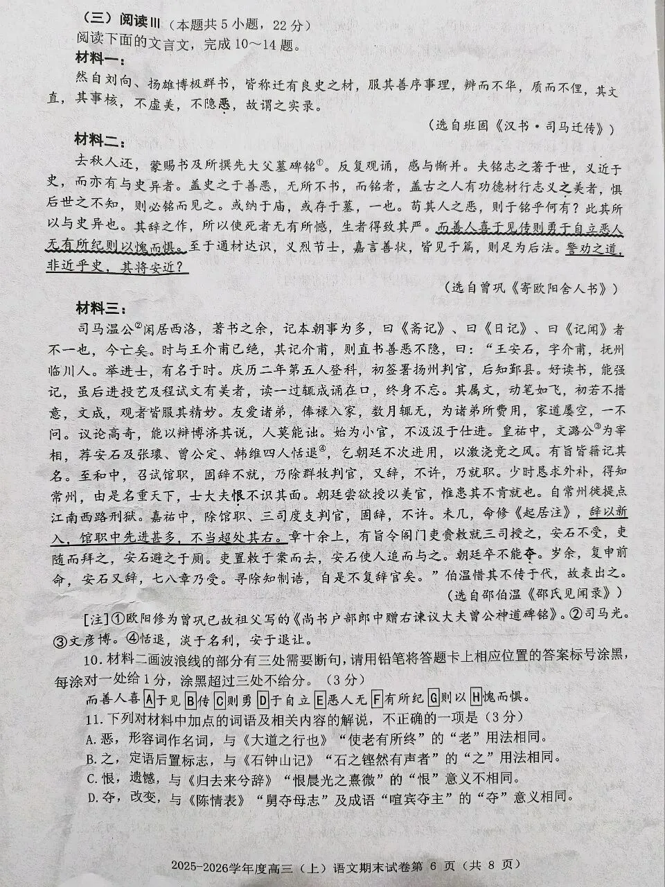 ③材料三:借司马光对王安石生平的真实记录,称颂司马光直书善恶、毫不隐晦的精神。(2分。只答称颂王安石诸优点的,不给分。)