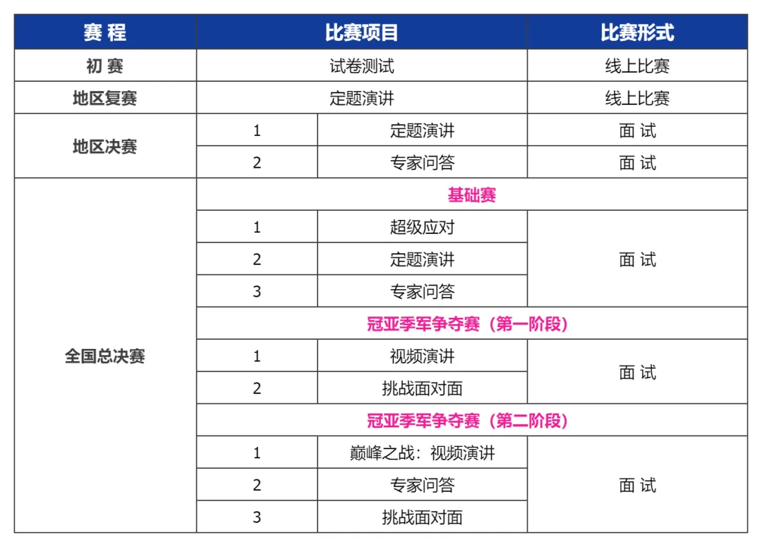 选手需提前准备演讲内容,入场后没有准备时间,评委示意后即开始演讲,同时开始计时;